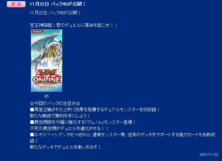 パック45(TACTICAL EVOLUTION) その他 2007年11月22日 パック45(TACTICAL EVOLUTION)が実装されました。今回は予想が当たった。さて、注目すべきカ-ドですが、まず新ジャンルのデュアルモンスタ-《ヘルカイザー・ドラゴン》と《水面のアレサ》。他にも数種ありますが、この2種は使えます。あとは墓地もモンスタ-を除外して特殊召喚するモンスタ-である《氷炎の双竜》と 《デザート・ツイスター》。こちらもあと数種存在します。あとはE・HEROの追加。《E・HERO ダーク・ブライトマン》やネオスの融合体である 《E・HERO マグマ・ネオス》 と 《E・HERO マリン・ネオス》。そしてE・HERO専用のドロ-カ-ド《ホープ・オブ・フィフス》あとはネオスやネオ・スペ-シアンの補助系カ-ド等も数種。それら以外で注目すべきはヴェノムモンスタ-達。そして新しい特殊勝利モンスタ-の《毒蛇神ヴェノミナーガ》。他にはヴォルカニック、エ-リアン、六部衆の追加カ-ドなど。あとシモッチバ-ン用の《ギフトカード》。《聖なる魔術師》の下位互換である《水晶の占い師》。これらを組み込んだ水晶帝と言うデッキもあります。あとアンデットデッキ必須となる《ゾンビ・マスター》。これの蘇生効果を使ったアンデットは爆発すると手がつけられなくなる。しかし一番の注目はパックの顔でもある 《究極宝玉神 レインボー・ドラゴン》ですね。ぜひとも呼んでみたいモンスタ-ではあります。とりあえずしばらくはパックを空ける日々が続きそうです。とりあえずデュエルパスを購入せねば。 PR