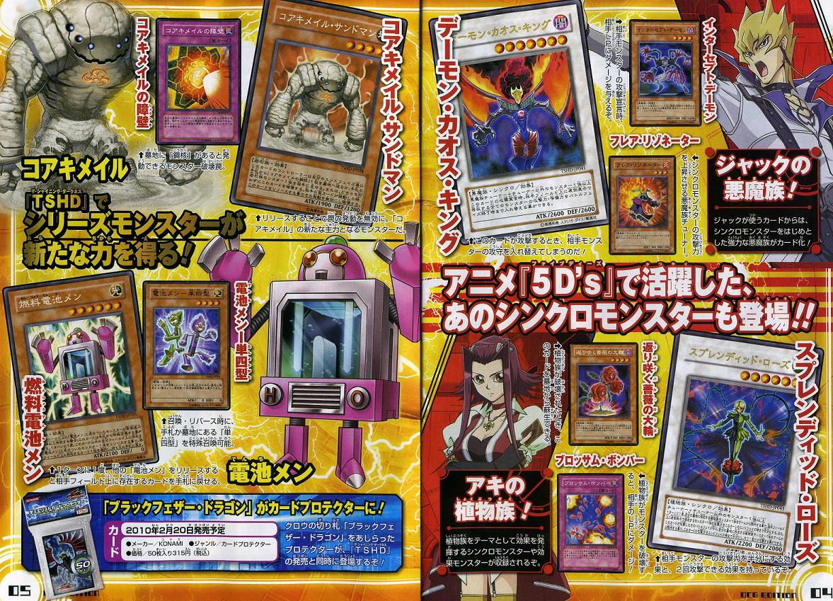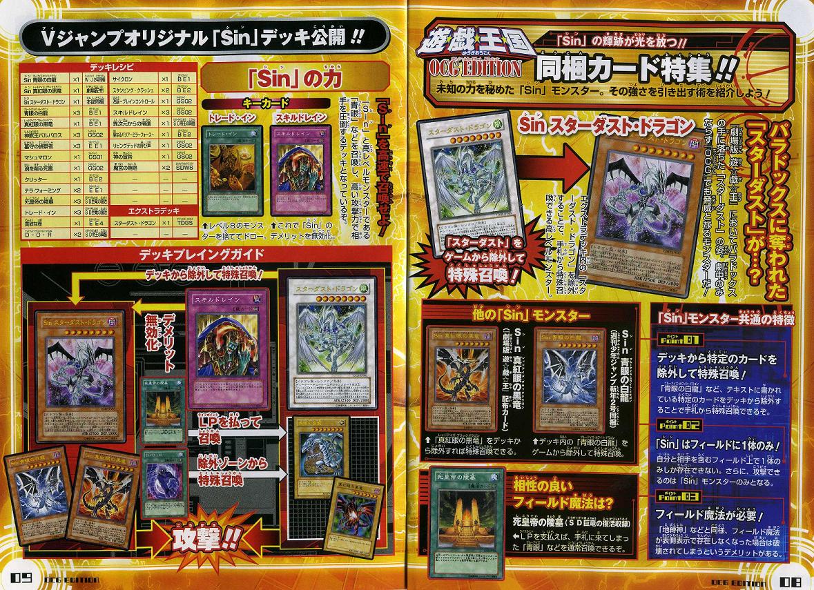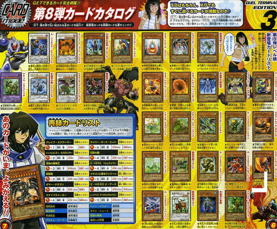 VJ確認情報 その2 その他 2010年01月20日 さてVJ確認情報その2OCG関係です。2月に発売されるTHE SHINING DARKNESSに収録される一部カードの紹介アニメ5DSの5龍の最後 《ブラックフェザー・ドラゴン》が登場。 《ブラックフェザー・ドラゴン》 シンクロ・効果モンスター星8/闇属性/ドラゴン族/攻2800/守1600チューナー+チューナー以外のモンスター1体以上自分がカードの効果によってダメージを受ける場合、代わりにこのカードに黒羽カウンターを1つ置く。このカードの攻撃力は、このカードに乗っている黒羽カウンターの数×700ポイントダウンする。1ターンに1度、このカードに乗っている黒羽カウンターを全て取り除く事で、相手フィールド上に表側表示で存在するモンスター1体の攻撃力を黒羽カウンターの数×700ポイントダウンし、ダウンした数値分のダメージを相手ライフに与える。なかなか面白い効果を持っています。あとはBF関係が強化。ドローソースの《黒羽の宝札》《黒羽の宝札》 通常魔法手札から「BF」と名のついたモンスター1体をゲームから除外して発動する。自分のデッキからカードを2枚ドローする。このカードを発動するターン、自分はモンスターを特殊召喚する事ができない。「黒羽の宝札」は1ターンに1枚しか発動できない。手札のBFを除外し2枚ドロー。除外されるBFを《異次元の埋葬》で墓地に戻すことを前提とするならば、手札から送るBFは《BF-大旆のヴァーユ》がベストなんでしょうかね-。その他は各メインキャラクターを満足さんのインフェルニティが大幅強化される様子。ジャックやアキがアニメで使用したカードもここで一部がOCG化されます。あとは今月号付属のを活用するデッキ等の紹介。GOLD2010に収録される一部カードの紹介期待が持てるのでしょうか?。来月号のVJに収録される映画で登場するカード。どうみてもブラック・マジシャンズ・ナイトの真似っこです。DT第8弾、トリシューラの鼓動の収録カードリスト。最後にDTの攻略本に収録されるA・ジュネクスの紹介。DS、PSP関係は別記事にて。 PR