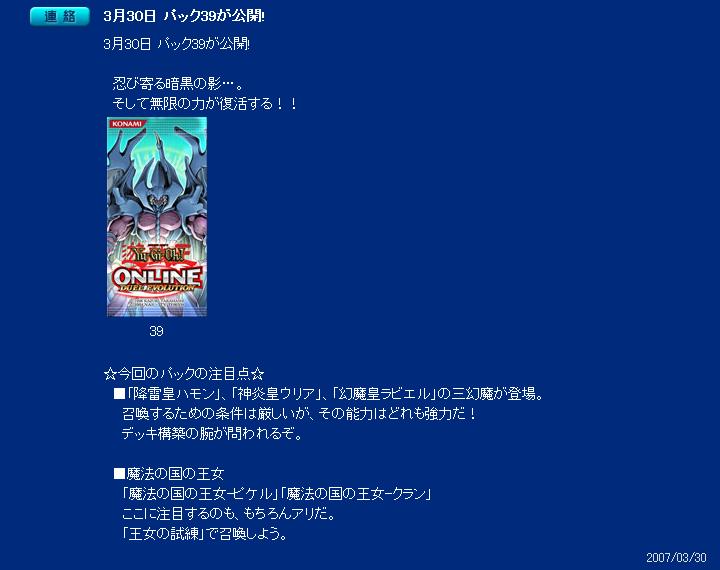 パック39 その他 2007年03月31日 パック39が実装。このパックの目玉はやはり《黄泉ガエル》でしょう。三幻魔もありますが召還条件が厳しいのであとはサイドラシリ-ズや昆虫族おまけでピケルとクラン。三幻魔は一度は呼んでみたいですね。そのためにもまずはパックをあけないと。