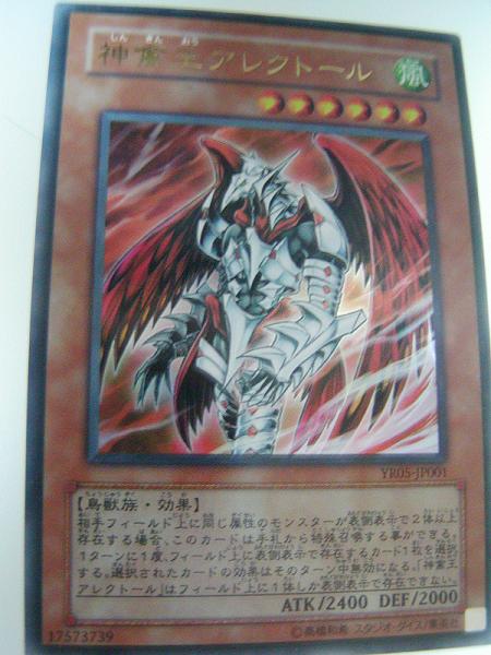神禽王アレクトール その他 2008年05月15日 OCGカ-ド紹介3回目遊戯王R5巻付属のカ-ド《神禽王アレクトール》まずは効果。《神禽王アレクトール》 効果モンスター星6/風属性/鳥獣族/攻2400/守2000相手フィールド上に同じ属性のモンスターが表側表示で2体以上存在する場合、このカードは手札から特殊召喚する事ができる。1ターンに1度、フィールド上に表側表示で存在するカード1枚を選択する。選択されたカードの効果はそのターン中無効になる。「神禽王アレクトール」はフィールド上に1体しか表側表示で存在できない。手札から特殊召喚出来るタイプなので使える部類。ATKの2400のラインを満たしているので問題は無い。鳥獣族なので、ネフティスあるいはハ-ピィデッキには入る部類ですな。さてOCGカ-ド紹介もネタが尽きた。久しぶりにCPU対戦日でもあげようか。(手抜きしまくり)