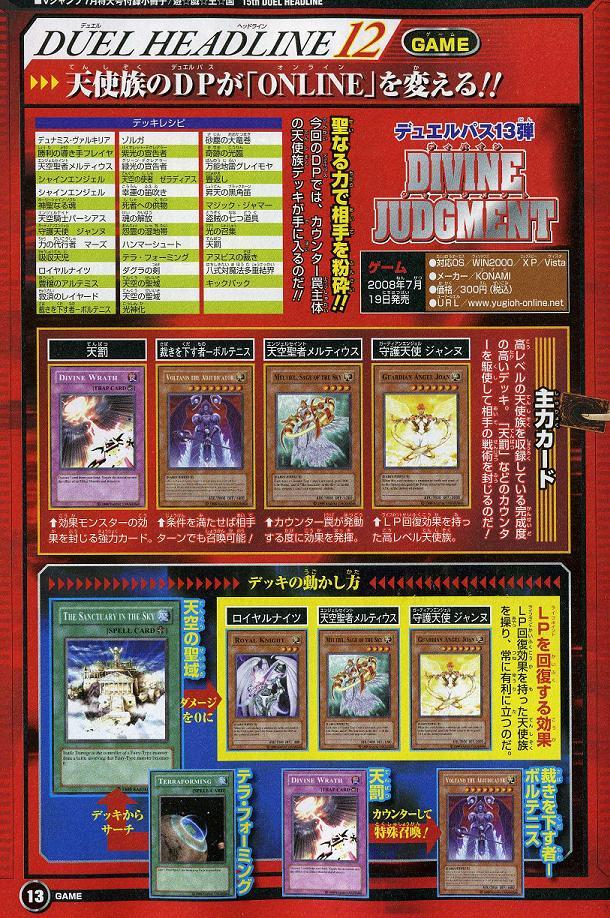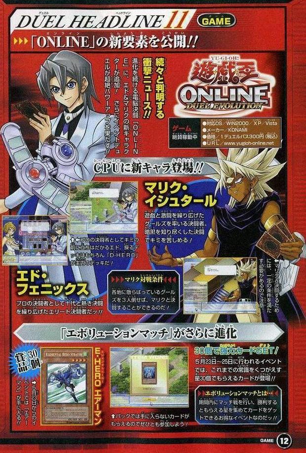 VJ情報 その他 2008年05月20日 さていつものごとくVJ情報すでに既出ですが、まずはCPUの追加前から出ていた、エド・フェニックスとマリク・イシュタ-ル。エドはブル-Dを使ってくるのか。マリクはラ-の翼神竜を使ってくるものと思われます。実装時期の記載はなくマリクについては3人のグ-ルズを倒さなければいけないようです。もう一つは次のデュエルパス。ディバイン・ジャッジメントの最初に入力したときにもらえるストラクの内容についての記載。ONLINE関係についてはそんなところでした。OCG関係はまた別の記事にて。