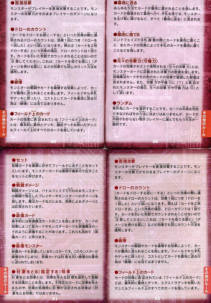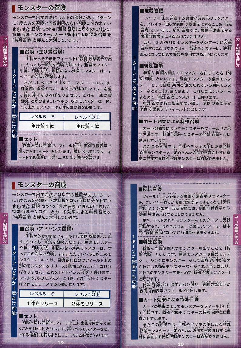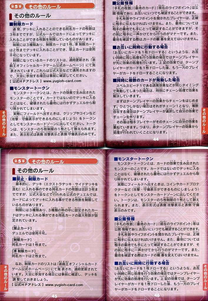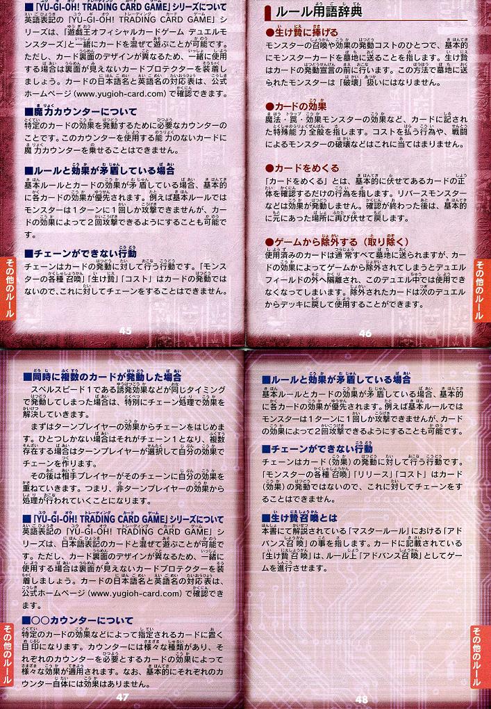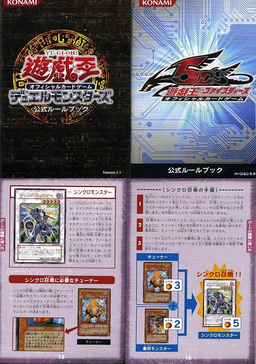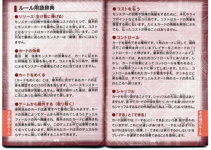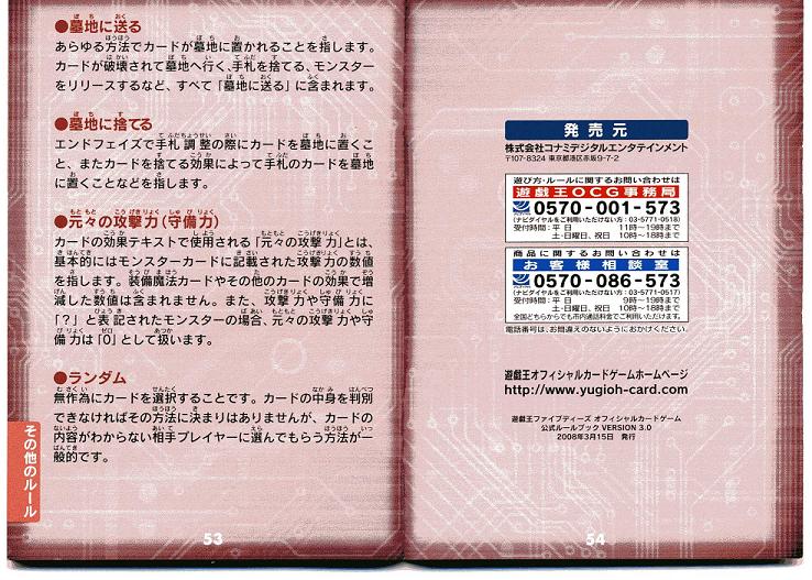 OCGカ-ドゲ-ム公式付属の取扱説明書 その他 2008年04月08日 さて、来週末にはOCG第6期最初のブ-スタ-パックが発売されるわけですがその前にちょっとだけ、シンクロ召喚や用語についておさらい。まず、公式名称の変更。今までの使用していたカ-ドについてはそのまま使用可能。あとシンクロモンスタ-の召喚についての記述がなされています。そして今までの生贄召喚と言う用語をモンスタ-をリリ-スすると言う用語へ変更。このあたりは大人の事情と言うヤツでしょうかね。そのままでも問題ないかと思うのだが、言葉の意味を大人達がしっかり教えていればですが。正式用語名は生け贄召喚→アドバンス召喚。モンスタ-を生け贄にする ↓モンスタ-をリリ-スする。これらが公式の用語となります。それらの記述がされていることが以前との違いです。融合デッキについては融合デッキ→エクストラデッキへ名称変更。そして融合デッキ枚数が15枚へと変更。サイドデッキについては以前は15枚入れなければならなかったのですが1枚~15枚までに変更となりました。詳しい違いについては画像を参照してください。オンラインではあと一年は先のことでしょうか。そのころにはシンクロ召喚がどのような進化を遂げているのか、興味が尽きないところです。