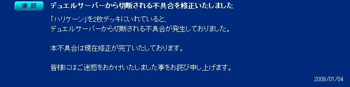 定期メンテナンス その他 2008年01月18日 定期メンテナンス完了のお知らせ 今回のメンテナンスにて下記の仕様変更を行いました。1)新機能「チーム機能」を追加!詳細についてはこちらをご覧ください。 ↑前から噂があったが来た様だな。↓定期メンテナンス完了のお知らせ 今回のメンテナンスにて下記の仕様変更を行いました。1)チーム機能追加されました。2)デュエル中に表示されるカード状態アイコンを追加・変更しました。3)デュエル中のモンスターカードをセットする時のアイコンを変更しました。 ↑公式文訂正されていました。