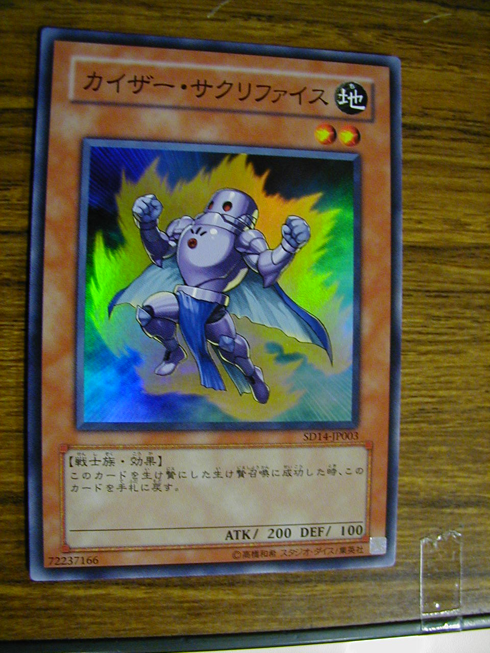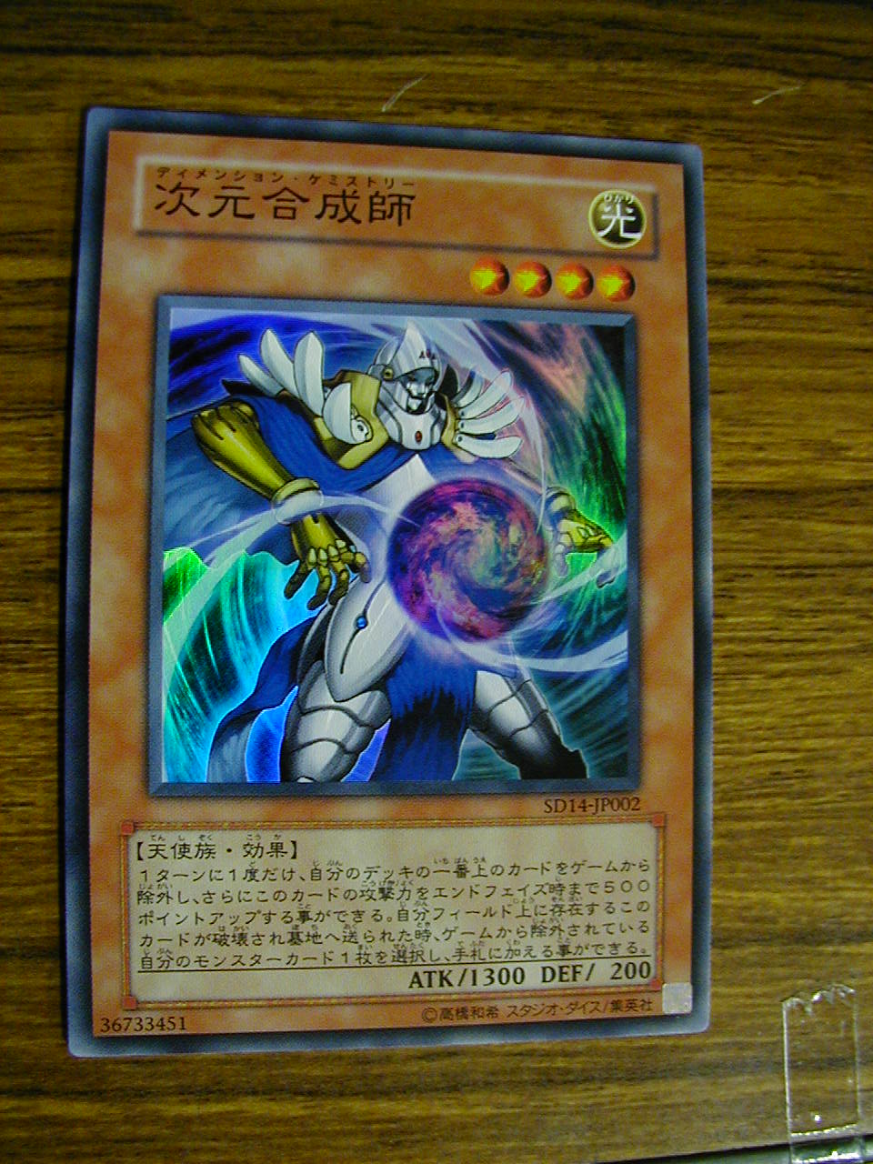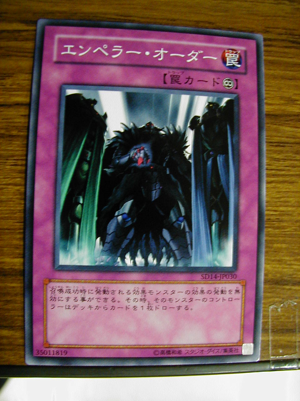 ストラクチャ-デッキ 帝王の降臨 その他 2008年01月08日 さて、リアルで年末に発売されたストラクチャ-デッキ 帝王の降臨デッキ内容からみて次元帝の構成でした。その中から、ストラクにのみ付属するカ-ドちょっとばかり。《邪帝ガイウス》 効果モンスター星6/闇属性/悪魔族/攻2400/守1000このカードの生け贄召喚に成功した時、フィールド上に存在するカード1枚を除外する。除外したカードが闇属性モンスターカードだった場合、相手ライフに1000ポイントダメージを与える。このストラクの看板カ-ド。ようやく実装された最後の闇の帝。効果を見る限り、《雷帝ザボルグ》の上位互換。効果により除外するカ-ドが闇属性だった場合コントロ-ラ-に1000ポイントのダメ-ジ。闇属性は大概のデッキに入っているので充分メタになる。オンラインでガンス7連になったらギオン以上の価値だな。 《次元合成師》効果モンスター星4/光属性/天使族/攻1300/守 2001ターンに1度だけ、自分のデッキの一番上のカードをゲームから除外し、さらにこのカードの攻撃力をエンドフェイズ時まで500ポイントアップする事ができる。自分フィールド上に存在するこのカードが破壊され墓地へ送られた時、ゲームから除外されている自分のモンスターカード1枚を選択し、手札に加える事ができる。なかなかにいい効果を持っている。黒忍者デッキにも入るし、除外された帝の再利用等と幅広い使い方ができそうだ。《カイザー・サクリファイス》 効果モンスター星2/地属性/戦士族/攻 200/守 100このカードを生け贄にして生け贄召喚に成功した時、このカードを手札に戻す。《黄泉ガエル》の下位互換といったところですか。戦士族なので、サポ-トカ-ドも豊富だしこちらも幅広い使い方ができそうだ。 《D・D・R》装備魔法手札を1枚捨てる。ゲームから除外されている自分のモンスター1体を選択して攻撃表示でフィールド上に特殊召喚し、このカードを装備する。このカードがフィールド上から離れた時、そのモンスターを破壊する。《混沌の黒魔術師》と組み合わせても楽しそうだしDブレ-ドに入れても楽しそうだ。《エンペラー・オーダー》 永続罠召喚成功時に発動される効果モンスターの効果の発動を無効にする事ができる。その時、そのモンスターのコントローラーはデッキからカードを1枚ドローする。これもまた、汎用性の広いカ-ドですね。《光帝クライス》と組み合わせてドロ-ブ-ストも出きるしエグゾ等のドロ-系デッキに入れてもいいな。さて5種類とも 強力な効果を持つカ-ドばかり。帝プッシュだなコンマイ。リアルでは、まだ売り切れが続いているようだ。3月の制限改定が少し気になるところです。カ-ドリスト《邪帝ガイウス》1 《次元合成師》1 《カイザー・サクリファイス》1 《異次元の戦士》 1 《炎の女暗殺者》 1 《光の追放者》 1 《異次元の偵察機》 2 《カオスライダー グスタフ》 1 《雷帝ザボルグ》 1 《氷帝メビウス》 1 《炎帝テスタロス》 1 《地帝グランマーグ》 1 《異次元の生還者》 2 《D・D・M》 1 《閃光の追放者》 1 《風帝ライザー》 1 《D・D・R》 1 《収縮》 1 《クロス・ソウル》 1 《抹殺の使徒》 1 《魂の解放》 1 《ビッグバン・シュート》 1 《次元の歪み》 1 《魂吸収》 1 《エネミーコントローラー》 1 《天よりの宝札》 1 《洗脳-ブレインコントロール》 1 《次元の裂け目》 2 《トルネード》 1 《エンペラー・オーダー》 1 《異次元からの帰還》 1 《砂塵の大竜巻》 1 《死霊の巣》 1 《神の宣告》 1 《黄金の邪神像》 1 《マクロコスモス》 1 《カウンター・カウンター》 1