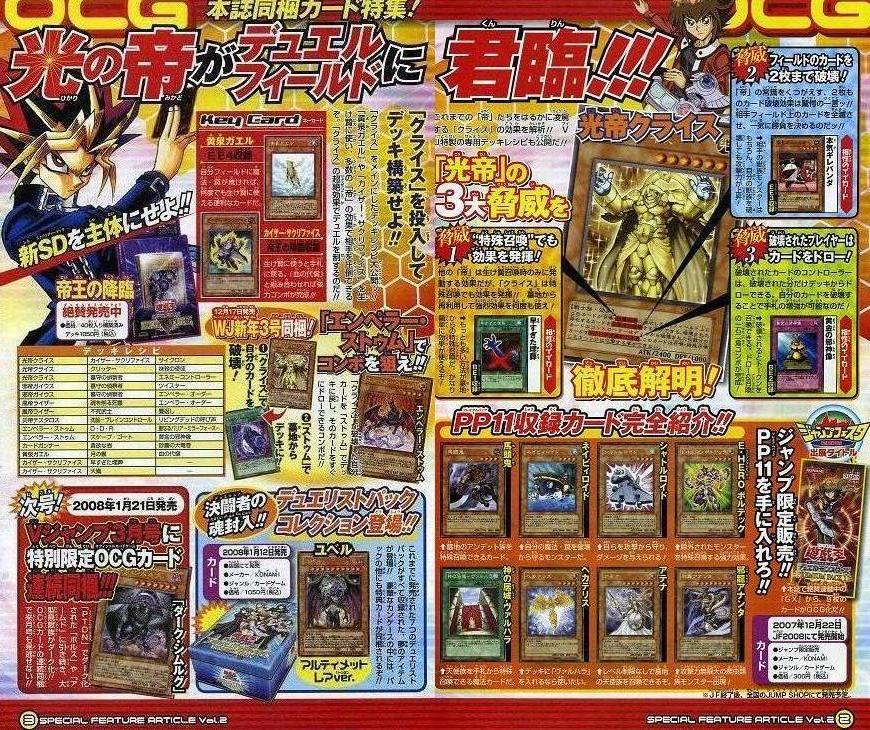 Vジャン情報 その他 2007年12月20日 噂のカ-ド《光帝クライス》が付属するVジャンプが発売。まずはOCGの情報についてですが、次のOCGの新パックライトオブディストラクションについての一部情報が紹介されていました。《オネスト》を筆頭にアルカナモンスタ-やついこの間GXにて登場した、新モンスタ-たちが早くもOCG化。まあ、このあたりは誰もが予想の範疇ではあると思われますが、そして今回の目玉である、噂の光の帝《光帝クライス》 について、結構な壊れカ-ドです。《光帝クライス》効果モンスター星6/光属性/戦士族/攻2400/守1000 このカードが召喚・特殊召喚に成功した時、フィールド上に存在するカードを2枚まで破壊する事ができる。破壊されたカードのコントローラーはデッキから破壊された枚数分のカードをドローする事ができる。このカードは召喚・特殊召喚したターンには攻撃する事ができない。その能力については2~3ありましたが、ほぼ予想していた能力に落ち着いたようですね。完全とはいえませんが《氷帝メビウス》の上位互換と言うべきですか。但し、破壊したカ-ドのコントロ-ラ-がドロ-すると言う効果なので状況に応じて破壊するカ-ドを選ぶべきでしょう。しかし今までの帝とは違い優秀なサポ-トカ-ドが多い戦士族なので《増援》や《戦士の生還》で使いまわすことも可能。しかし今までの帝との最大の違いはその能力発動が召喚及び特殊召喚時、両方に於いて発揮されると言うこと。これが最大の違いですね。おそらくONLINEに実装されるのは1年は先ですか。使ってみたいカ-ドではありますね。戦士族デッキやデッキ破壊デッキに投入するのもありかな。ONLINEの情報については次のデュエルパスの内容について書かれていました。そちらについては別の記事にてUPしたいと思います。