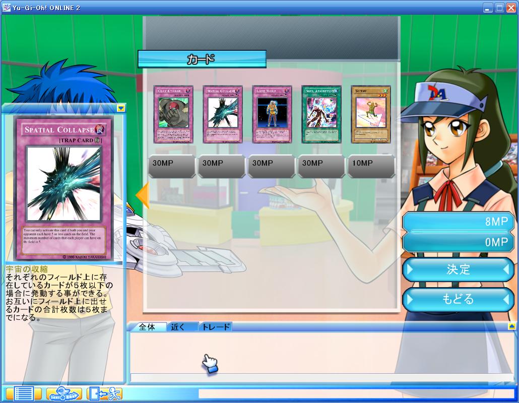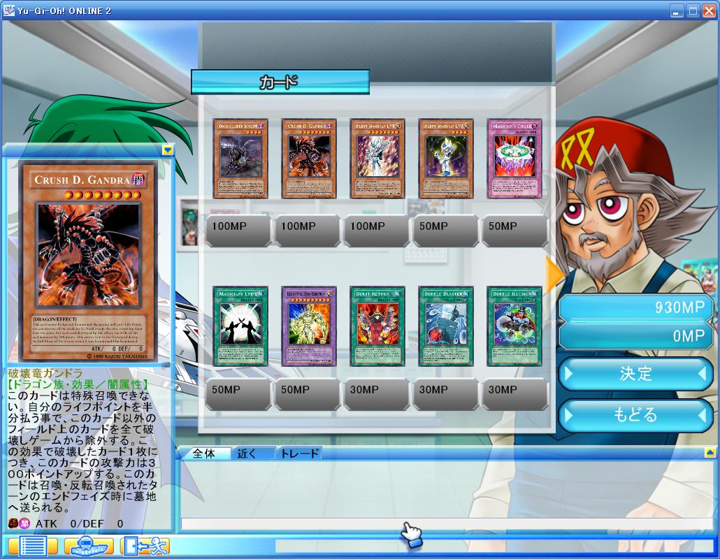スゴロクの店、アカデミア購買部 その他 2007年10月13日 今日のメンテの正体は待ちにまったSHOPの実装でした。いきなり当日に発表無しの実装はさすがコンマイクオリティ。くわしい内容等については公式HPを見てもらうとしてようやくたまりにたまったマイレ-ジを使うときが来た。マイレ-ジはポイントに変換されそのポイントでカ-ドやアバタ-パ-ツを購入するもの。ようやく来ましたよデスカリが。当然3枚ゲット。他にもガンドラやサイレントマジシャンなどが。ポイントは2500ほどあったので各3枚取ることはできますがしばらく様子見です。アバタ-アイテムについてはデュエルディスクをゲット。CPUが使っている物です。欲しかったんだよあのディスクは。さあ、この調子で運営もがんばってくれコンマイ。 PR