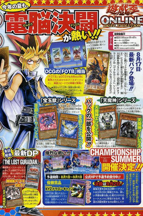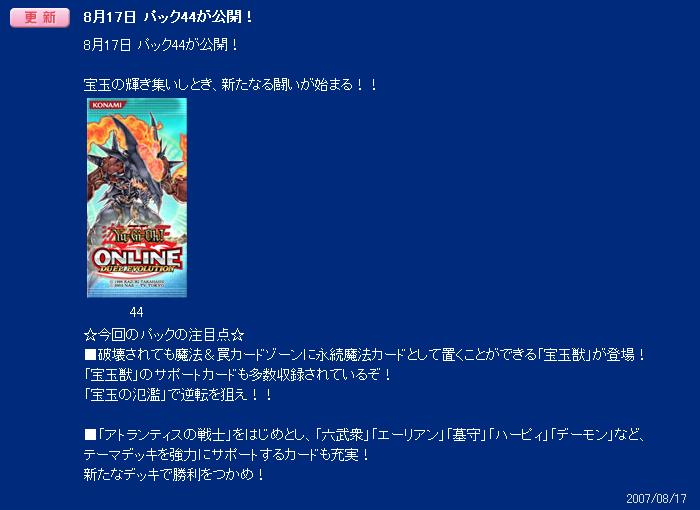 パック44(FORCE OF THE BREAKER) その他 2007年07月18日 予定通りであれば、今週末パック44(FORCE OF THE BREAKER)が実装されます。このパックの目玉はやはり宝玉獣たちでしょう。《宝玉獣 ルビー・カーバンクル》 《宝玉獣 アメジスト・キャット》 《宝玉獣 エメラルド・タートル》 《宝玉獣 トパーズ・タイガー》 《宝玉獣 アンバー・マンモス》 《宝玉獣 コバルト・イーグル》 《宝玉獣 サファイア・ペガサス》上記の宝玉獣達7体とそれら宝玉獣をサポ-トするカ-ド《宝玉の導き》 《レア・ヴァリュー》 《宝玉の恵み》 《宝玉の氾濫》 《宝玉の契約》 《虹の古代都市-レインボー・ルイン》特に《レア・ヴァリュー》は宝玉獣専用とはいえ禁止カ-ドの 《強欲な壷》と同じ2枚ドロ-の効果。このアドバンテ-ジはかなり大きいかと。あとは今回初出の《ヴォルカニック・デビル》 とそれら系列のカ-ド。こちらについてはまだ不足しているので次の次のパックが出てからですね、専用デッキが構築できるのは。そしてこちらも今回初出の天魔神。《天魔神 エンライズ》 《天魔神 ノーレラス》 《天魔神 インヴィシル》の上記3体。こちらはデミスド-ザ-と同じ、《高等儀式術》と使った、《儀式天魔神》と言うデッキがあるので、一部OCG経験者であればデミスからそちらへ流れるのではないかと思われる。特に《天魔神 エンライズ》は劣化《カオス・ソ-サラ-》使い方次第ではかなり強力かと。但し、特殊召喚時のコストがかなり厳しいですが。《天魔神 ノーレラス》は劣化した《混沌帝龍 -終焉の使者-》しかも1枚とはいえドロ-効果を持つのは大きい。最後は《天魔神 インヴィシル》。どっかで聞いたことがあるような名前ですが生贄にささげたモンスの種類によって効果が2つあるのはなかなか面白い。そして最後を飾るのは風の帝、 《風帝ライザー》。状況次第ですが、バウンス効果は使い方次第でかなり脅威です。大体これくらいが注目すべきカ-ドかと。あとミラ-フォ-スやサイクロンの下位互換等もありますが、あまり意味はないかと。とりあえず、宝玉獣系のカ-ドはすべて3枚集めねば。(サブIDとフレの分を含めるとあと9セット必要になる。どれだけパスがいることやら。)画像のみ追加しました。(8/22)