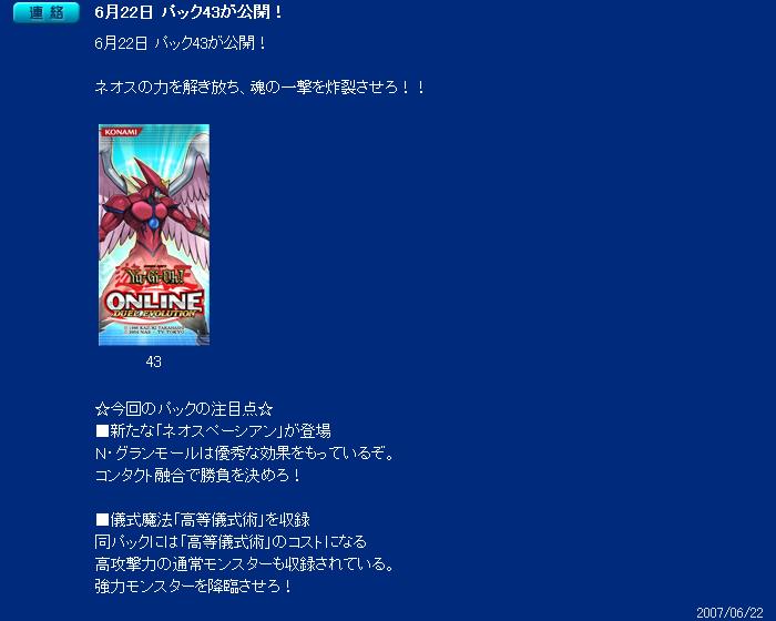 パック43(STRIKE OF NEOS) その他 2007年06月21日 明日はパック43(STRIKE OF NEOS)が実装されます。このパックはかなりの数、注目カ-ドがあります。まずはネオ・スペ-シアン、残りの3体。《N・エア・ハミングバード》 《N・グラン・モール》 《N・グロー・モス》 これで各属性のネオ・スペ-シアンたちがそろいました。特に《N・グラン・モール》のバウンス効果はかなり優秀です。通常のスタンデッキにも入ります。唯、攻撃力の低さが目立ちますが、これはしかたありません。あとは残るネオスの融合体《E・HERO エアー・ネオス》 《E・HERO グラン・ネオス》《E・HERO グロー・ネオス》これでようやくネオスデッキが組めます。そのほかネオスデッキの補助に《摩天楼2-ヒーローシティ》、 《正統なる血統》もあるので、これらを使いこなせれば充分楽しめると思います。次は今回初出の六武集。こちらは 《大将軍 紫炎》 を筆頭に組む形ですが、、まだ少しカ-ドがたりません。次に暗黒界での注目は《暗黒界の魔神 レイン》。扱いが少し難しいカ-ドですが、効果は強力です。そのほかいろいろありますがバニラモンで攻撃力2000の《ジェネティック・ワーウルフ》まあサイドラがいるのであまり出番がないかもしれませんが。あとは、《帝》、《黄泉ガエル》対策に《畳返し》と 《D.D.クロウ》。デミスド-ザ-必須の 《高等儀式術》 。こんな所ですか。明日はがんばってパックあけねば。デュエルパス足りるかな。