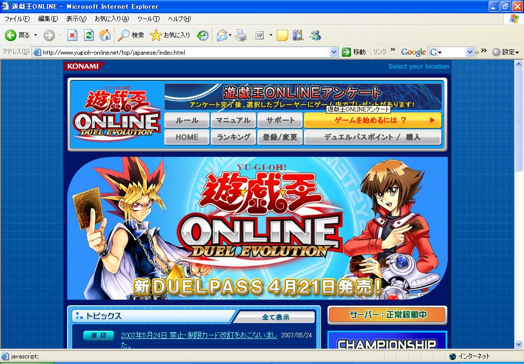 メンテナンス完了のお知らせ その他 2007年06月08日 定期メンテナンス完了のお知らせ 今回のメンテナンスで下記の内容を追加いたしました。1)デュエルの演出をリニューアルしました。 2)Webでアンケートに回答するとゲーム内でアイテムがもらえます。 アンケ-トに答えるとアカデミアのデュエルディスク(サイクロンがもらえる)上記がそのディスク。今回はいい仕事したな、コンマイ。その調子でがんばって欲しい。