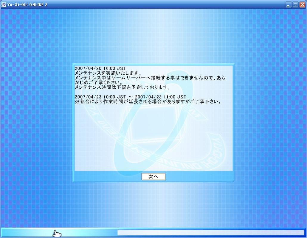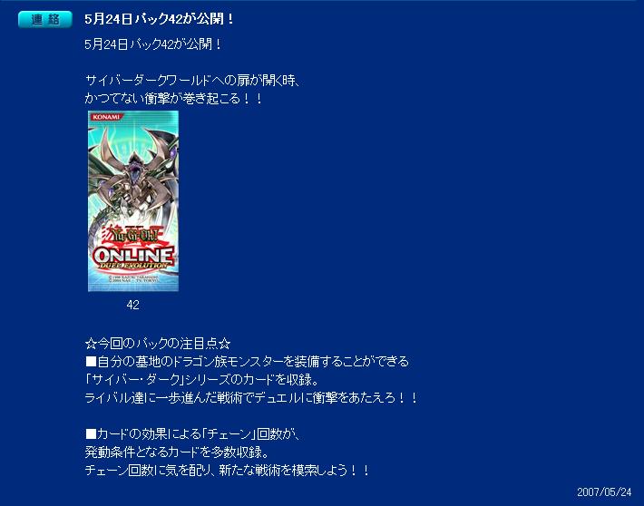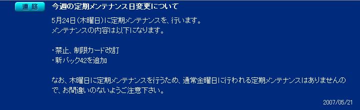 定期メンテナンス その他 2007年05月11日 定期メンテナンス完了のお知らせ 今回のメンテナンスにて下記の不具合を修正いたしました。1.「アストラルバリア」を使用すると、デュエルが進行しなくなる場合がある不具合を修正しました。2.「地獄の扉越し銃」が正しく効果を発動しない場合がある不具合を修正しました。3.「最近のデュエルログ」が100件以上になったとき、最新のものから順に削除されていた不具合を修正しました。 今回はメンテのみらしい。まあ予想通りと言うべきか。これで、トライアルはのんびり行けそうだな。それより、ヤツが現れる対策メンテはどうした。メ-ル何度も送ってるが返事がねえぞ、コンマイ。