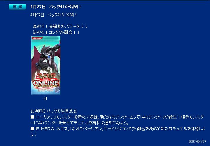 パック41 その他 2007年04月28日 まちにまったパック41が実装。注目すべきカ-ドが違うと思うが。コンマイの戯言はさておき、注目すべきカ-ド、まずはD-HERO達からは《D-HERO ダブルガイ》《D-HERO ドグマガイ》《D-HERO ダッシュガイ》の3体。そして今回初出のN・スペ-シアン達。《N・アクア・ドルフィン》《N・フレア・スカラベ》《N・ブラック・パンサー》そして、《E・HERO ネオス》そのネオスと融合して現れる。《E・HERO アクア・ネオス》《E・HERO フレア・ネオス》《E・HERO ブラック・ネオス》そして以前にも書きましたが《キメラテック・オーバー・ドラゴン》《未来融合-フューチャー・フュージョン》 《オーバーロード・フュージョン》 これに尽きるでしょう。さて、キメラ1キルがどう言った形のものが出てくるか、こわくもあるし楽しくもあります。