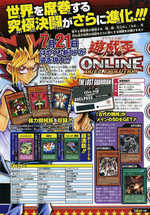 Yu-Gi-Oh! ONLINE DUELPASS THE LOST GUARDIAN その他 2007年05月21日 VJ情報が掴めたので再度内容を 載せます。内容については、機械の叛乱ベ-スYu-Gi-Oh! ONLINE DUELPASS THE LOST GUARDIAN モンスタ-《メカ・ハンター》、《パーフェクト機械王》《キャノン・ソルジャー》、 《人造人間ーサイコ・ショッカー》 《機動砦のギア・ゴーレム》、《古代の機械巨人》《古代の機械獣》、《古代の機械兵士》2、《古代の歯車》2《古代の機械砲台》、《強化支援メカ・ヘビーウェポン》《魔鏡導士リフレクト・バウンダー》、《ルーレットボマー》《スフィア・ボム 球体時限爆弾》《魔貨物車両 ボコイチ》、《魔装機関車 デコイチ》魔法《大嵐》、《ガイアパワー》、《機械複製術》2《我が身を盾に》、《抹殺の使徒》、《リミッター解除》《地割れ》、《地砕き》、《ウェポンチェンジ》《古代の採掘機》、《貪欲な壺》、《古代の機械城》《古代の機械工場》、《自律行動ユニット》罠《激流葬》、《炸裂装甲》、《天罰》《黄金の邪神像》、《レアメタル化・魔法反射装甲》《援護射撃》、《ゲットライド!》ベ-スからかなり入れ替えてるな。トラップとマジックに一枚ずつ関連性ないカ-ドが、何故。ランダムについてはまだ不明、おそらく《グリーン・ガジェット》、《レッド・ガジェット》《イエロー・ガジェット》、《機動砦 ストロング・ホールド》《起動兵士デッドリボルバー》、《古代の機械巨竜》この6種と予想。しかしガジェットをランダムに回すとは商売上手なコンマイさん。