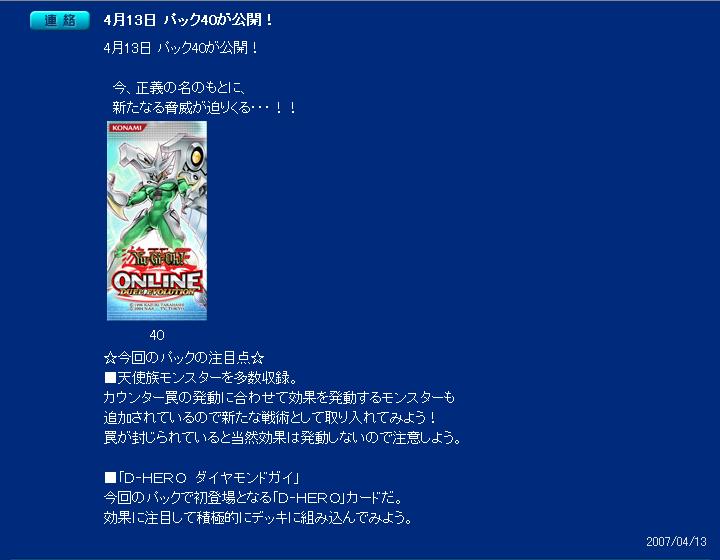 パック40 その他 2007年04月14日 パック40が実装。第4期のパックもこれが最後。このパックにも注目すべきカ-ドは多い。まず次元帝のパ-ツとなる《次元の裂け目》と《マクロコスモス》あとは残りのE-HERO達とその補助系カ-ド。これでようやくE-HEROデッキが組める。そして今回が初出のD-HERO達。D-HEROの注目カ-ドはやはり、《D-HERO ダイヤモンドガイ》ですね。D-HEROデッキは次のパックを待ってからですね。そして次のパック41はいよいよあのカ-ドが実装。《キメラテック・オーバー・ドラゴン》。これが実装される。パック41が実装されれば、しばらくの間は追加なしの日々となりますか。そのほうがバランスの為にもいいと思います。