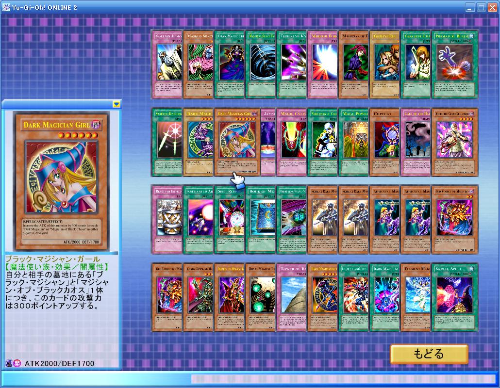 Yu-Gi-Oh! ONLINE DUELPASS SPELLCASTER'S UNITY その他 2007年04月08日 4月21日に発売のデュエルパスの内容について。Yu-Gi-Oh! ONLINE DUELPASS SPELLCASTER'S UNITYモンスタ-《ブラック・マジシャン》、《ヂェミナイ・エルフ》《仮面魔道士》、《聖なる魔術師》、《ものマネ幻想師》《霊滅術師 カイクウ》、《熟練の黒魔術師》2《見習い魔術師》2、《執念深き老魔術師》2《カオス・マジシャン》、《魔導戦士 ブレイカー》 《王立魔法図書館》、《混沌の黒魔術師》《エレメント・マジシャン》《ブラック・マジシャン・ガール》魔法《黒魔術のカーテン》、《サイクロン》、《千本ナイフ》《天使の施し》、《早すぎた埋葬》、《光の護封剣》《抹殺の使徒》、《魔導師の力》、《魔法効果の矢》《魔法再生》、《月の書》、《拡散する波動》《光と闇の洗礼》、《黒・魔・導》、《連続魔法》罠《神の宣告》、《聖なるバリア-ミラ-フォ-ス》《マジック・ジャマー》、《魔法の筒》、《リビングデットの呼び声》《迎撃準備》、《バベルタワー》ランダム《魔法石の採掘》、《D.D.アサイラント》《黒魔導の執行官》、《ブラック・マジシャン》(柄違い)《収縮》、《ディメンション・マジック》