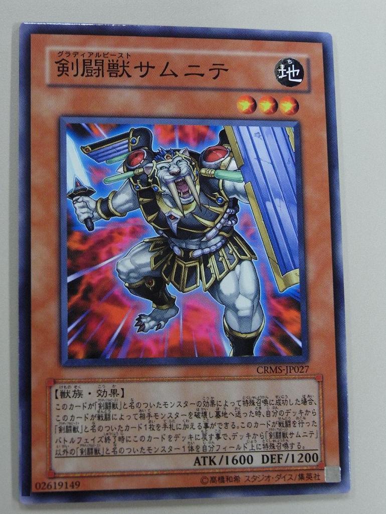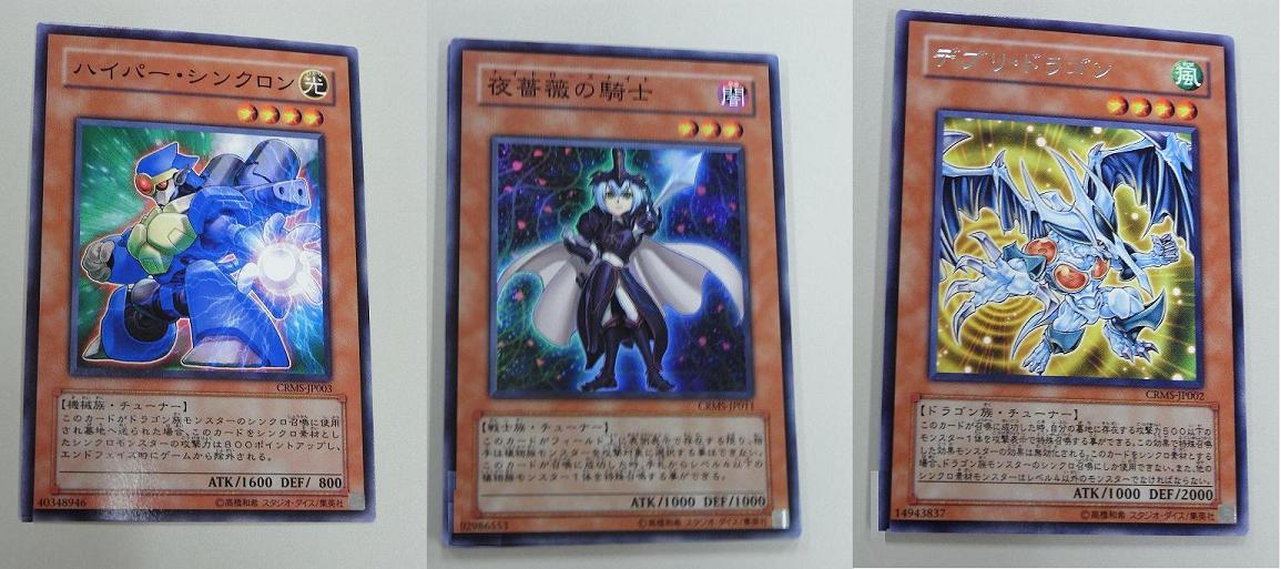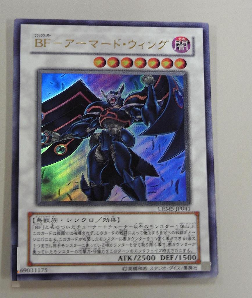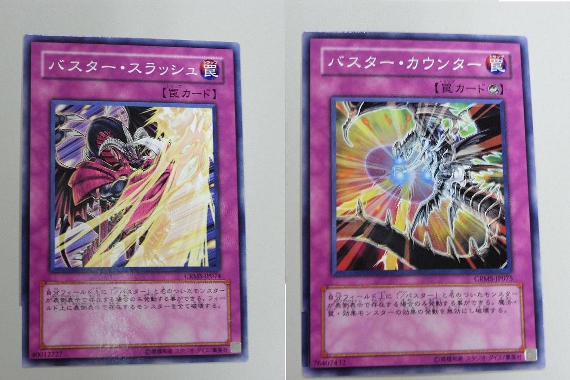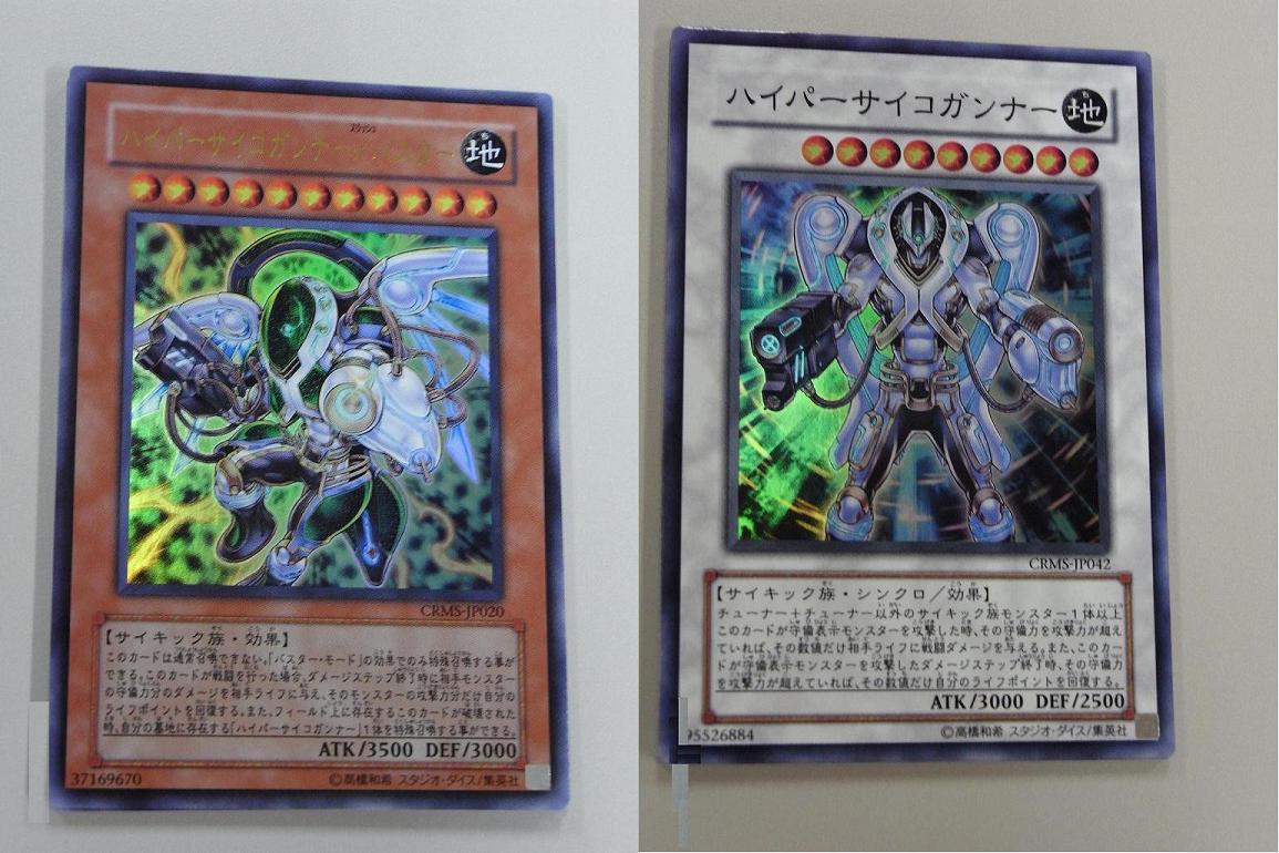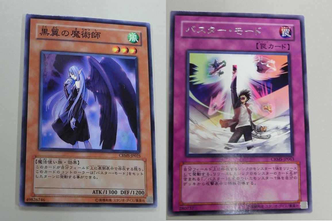 CRIMSON CRISIS(クリムゾン クライシス) その他 2008年11月19日 さて、今回は早めに紹介します。リアルの新ブ-スタ-、クリムゾンクライシス。先ずはバスタ-関連から《アーカナイト・マジシャン》 シンクロ・効果モンスター星7/光属性/魔法使い族/攻 400/守1800チューナー+チューナー以外の魔法使い族モンスター1体以上このカードがシンクロ召喚に成功した時、このカードに魔力カウンターを2つ置く。このカードに乗っている魔力カウンター1つにつき、このカードの攻撃力は1000ポイントアップする。また、自分フィールド上に存在する魔力カウンターを1つ取り除く事で相手フィールド上に存在するカード1枚を破壊する。《アーカナイト・マジシャン/バスター》効果モンスター星9/光属性/魔法使い族/攻 900/守2300このカードは通常召喚できない。「バスター・モード」の効果でのみ特殊召喚する事ができる。このカードが特殊召喚に成功した時、このカードに魔力カウンターを2つ置く。このカードに乗っている魔力カウンター1つにつき、このカードの攻撃力は1000ポイントアップする。このカードに乗っている魔力カウンターを2つ取り除く事で、相手フィールド上に存在するカードを全て破壊する。また、フィールド上に存在するこのカードが破壊された時、自分の墓地に存在する「アーカナイト・マジシャン」1体を特殊召喚する事ができる。魔法使い族のシンクロモンスタ-及びバスタ-後の姿です。年末発売のストラクを使えばもう少し強くなれるかな。《ハイパーサイコガンナー》 シンクロ・効果モンスター星9/地属性/サイキック族/攻3000/守2500チューナー+チューナー以外のサイキック族モンスター1体以上このカードが守備表示モンスターを攻撃した時、その守備力を攻撃力が超えていれば、その数値だけ相手ライフに戦闘ダメージを与える。また、このカードが守備表示モンスターを攻撃したダメージステップ終了時、その守備力を攻撃力が超えていれば、その数値だけ自分のライフポイントを回復する。《ハイパーサイコガンナー/バスター》 効果モンスター星11/地属性/サイキック族/攻3500/守3000このカードは通常召喚できない。「バスター・モード」の効果でのみ特殊召喚する事ができる。このカードが戦闘を行った場合、ダメージステップ終了時に相手モンスターの守備力分のダメージを相手ライフに与え、そのモンスターの攻撃力分だけ自分のライフポイントを回復する。また、フィールド上に存在するこのカードが破壊された時、自分の墓地に存在する「ハイパーサイコガンナー」1体を特殊召喚する事ができる。サイキック族のシンクロ及びバスタ-後の姿です。強いですね。次はバスタ-化のキ-カ-ド《黒翼の魔術師》 効果モンスター星3/風属性/魔法使い族/攻1300/守1200このカードが自分フィールド上に表側表示で存在する限り、このカードのコントローラーは「バスター・モード」をセットしたターンに発動する事ができる。《バスター・モード》 通常罠自分フィールド上に存在するシンクロモンスター1体をリリースして発動する。リリースしたシンクロモンスターのカード名が含まれる「/バスター」と名のついたモンスター1体を自分のデッキから攻撃表示で特殊召喚する。この2枚がないと、バスタ-はお話にならないかと。《バスター・スラッシュ》 通常罠自分フィールド上に「/バスター」と名のついたモンスターが表側表示で存在する場合のみ発動する事ができる。フィールド上に表側表示で存在するモンスターを全て破壊する。《バスター・カウンター》 カウンター罠自分フィールド上に「/バスター」と名のついたモンスターが表側表示で存在する場合のみ発動する事ができる。魔法・罠・効果モンスターの効果の発動を無効にし破壊する。バスタ-化後のサポ-トトラップ。最近はカウンタ-トラップが多くなってきてます。先に永続罠を張ってない限りはスペルスピ-ドの関係上無効に出来ないですね。時代はパ-ミへ変わっていくのかな。次はチュ-ナ-関係《ハイパー・シンクロン》チューナー(効果モンスター)星4/光属性/機械族/攻1600/守 800このカードがドラゴン族モンスターのシンクロ召喚に使用され墓地へ送られた場合、このカードをシンクロ素材としたシンクロモンスターの攻撃力は800ポイントアップし、エンドフェイズ時にゲームから除外される。《夜薔薇の騎士》 チューナー(効果モンスター)星3/闇属性/戦士族/攻1000/守1000このカードがフィールド上に表側表示で存在する限り、相手は植物族モンスターを攻撃対象に選択する事はできない。このカードが召喚に成功した時、手札からレベル4以下の植物族モンスター1体を特殊召喚する事ができる。《デブリ・ドラゴン》 チューナー(効果モンスター)星4/風属性/ドラゴン族/攻1000/守2000このカードが召喚に成功した時、自分の墓地に存在する攻撃力500以下のモンスター1体を攻撃表示で特殊召喚する事ができる。この効果で特殊召喚した効果モンスターの効果は無効化
