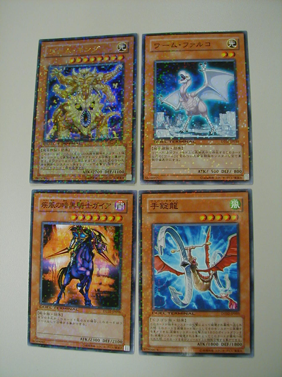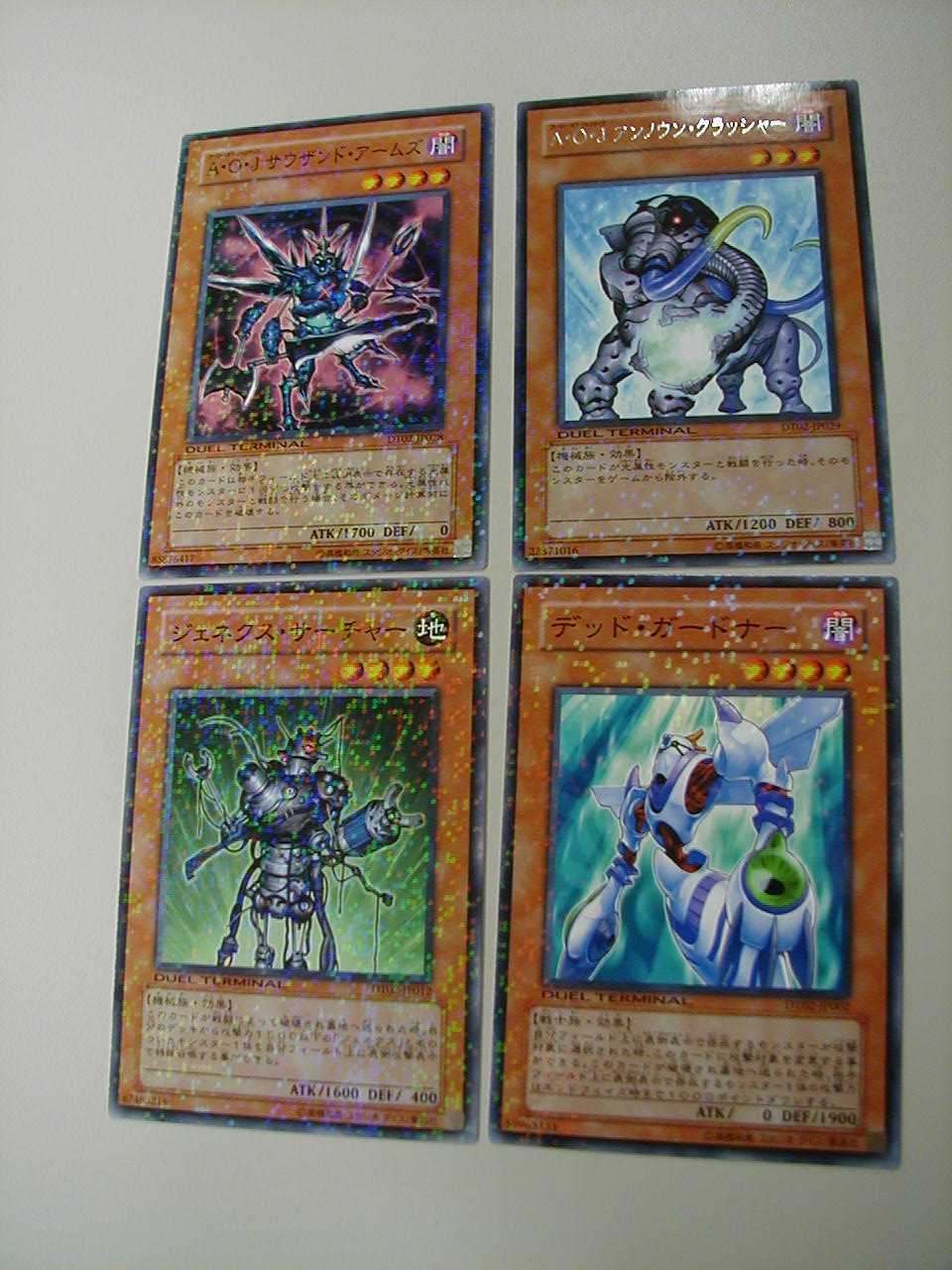 DUEL TERMINAL ワームの侵攻!! その他 2008年12月10日 さてさて以前DTを見に行ってカ-ドのみを取っておいたのでそちらの紹介でも《霞の谷の見張り番》 通常モンスター星4/風属性/魔法使い族/攻1500/守1900霞の谷を代々見張り続ける、見張り番一族の末裔。谷で起こる出来事は、どんな些細な事も見逃さない。ミストバレ-と言うシリ-ズのモンスタ-です。《霞の谷の風使い》 チューナー(効果モンスター)星2/風属性/鳥獣族/攻 400/守 800お互いの手札が5枚以上の場合に発動する事ができる。お互いのプレイヤーは手札が4枚になるように手札を墓地に送る。この効果は1ターンに1度しか使用できない。同じくミストバレ-と言う種族のチュ-ナ-です。 《X-セイバー パシウル》チューナー(効果モンスター)星2/地属性/戦士族/攻 100/守 0このカードは戦闘では破壊されない。このカードがフィールド上に表側守備表示で存在する場合、相手のスタンバイフェイズ毎に自分は1000ポイントダメージを受ける。Xと付くセイバ-シリ-ズのチュ-ナ-《フレムベル・アーチャー》 チューナー(効果モンスター)星3/炎属性/炎族/攻1000/守 200自分フィールド上に表側表示で存在する炎族モンスター1体をリリースして発動する。フィールド上に存在する「フレムベル」と名のついたモンスターの攻撃力はエンドフェイズ時まで800ポイントアップする。この効果は1ターンに1度しか使用できない。フレムベルシリ-ズのチュ-ナ-。《A・O・J サウザンド・アームズ》 効果モンスター星4/闇属性/機械族/攻1700/守 0このカードは相手フィールド上に表側表示で存在する光属性モンスターに1回ずつ攻撃をする事ができる。光属性以外のモンスターと戦闘を行う場合、そのダメージ計算前にこのカードを破壊する。《A・O・J アンノウン・クラッシャー》 効果モンスター星3/闇属性/機械族/攻1200/守 800このカードが光属性モンスターと戦闘を行った時、そのモンスターをゲームから除外する。A・O・Jシリ-ズの効果モンスタ-2種《ジェネクス・サーチャー》 効果モンスター星4/地属性/機械族/攻1600/守 400このカードが戦闘によって破壊され墓地へ送られた時、自分のデッキから攻撃力1500以下の「ジェネクス」と名のついたモンスター1体を自分フィールドに表側攻撃表示で特殊召喚する事ができる。ジェネクスシリ-ズの効果モンスタ-《デッド・ガードナー》 効果モンスター星4/闇属性/戦士族/攻 0/守1900自分フィールド上に表側表示で存在するモンスターが攻撃対象に選択された時、このカードに攻撃対象を変更する事ができる。このカードが破壊され墓地へ送られた時、相手フィールド上に表側表示で存在するモンスター1体の攻撃力はエンドフェイズ時まで1000ポイントダウンする。アニメで牛尾さんが使っていたカ-ド《ワーム・キング》効果モンスター星8/光属性/爬虫類族/攻2700/守1100このカードは「ワーム」と名のついた爬虫類族モンスター1体をリリースして表側攻撃表示でアドバンス召喚する事ができる。自分フィールド上に存在する「ワーム」と名のついた爬虫類族モンスター1体をリリースする事で、相手フィールド上のカード1枚を破壊する。《ワーム・ファルコ》 効果モンスター星2/光属性/爬虫類族/攻 500/守 800リバース:自分フィールド上に表側表示で存在するこのカード以外の「ワーム」と名のついた爬虫類族モンスターを全て裏側守備表示にする。ワ-ムシリ-ズの王様とそのモンスタ-《疾風の暗黒騎士ガイア》 効果モンスター星7/闇属性/戦士族/攻2300/守2100自分の手札がこのカード1枚のみの場合、このカードはリリースなしで召喚する事ができる。《手錠龍》 効果モンスター星5/風属性/ドラゴン族/攻1800/守1800このカードが相手モンスターの攻撃によって破壊され墓地へ送られた時、このカードを装備カード扱いとしてそのモンスターに装備する事ができる。装備モンスターの攻撃力は1800ポイントダウンする。装備モンスターが破壊される事によってこのカードが墓地へ送られた時、このカードを自分フィールド上に特殊召喚する事ができる。またまた牛尾さんが使っていたカ-ド。もう一つは説明はいらないでしょう。次は反撃(はんげき)のジャスティス!!のカ-ドでも上げてみます。 PR