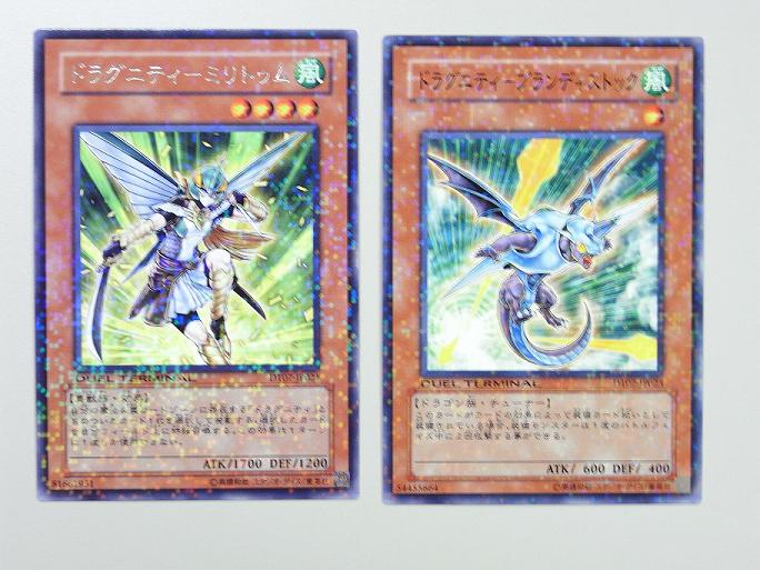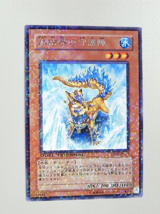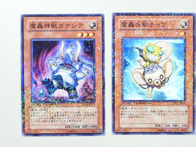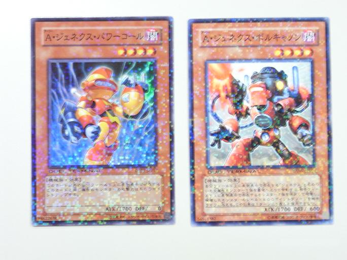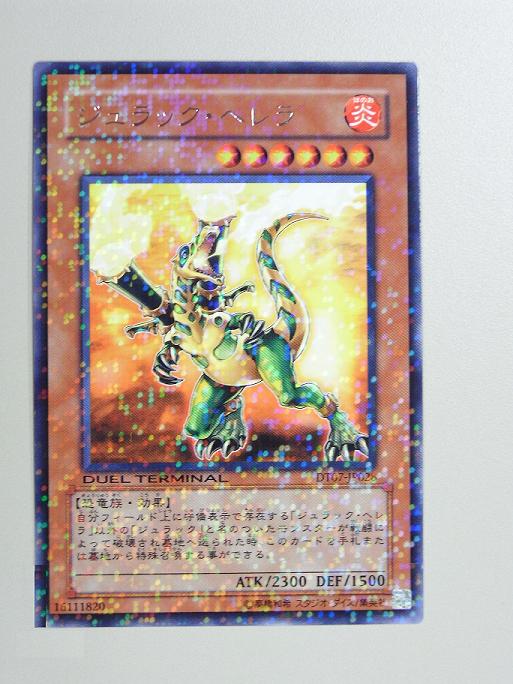 DUEL TERMINAL -ジェネクスの進撃!!- その他 2009年12月08日 さてかなり遅いですが、オンライン系はネタがもうないのでOCG関係でどうかと言うことでDT第6弾で引いたカード紹介です。《ジュラック・ガリム》 チューナー(効果モンスター)星2/炎属性/恐竜族/攻1200/守 0このカードが戦闘によって破壊され墓地へ送られた時に発動する。相手は手札を1枚捨ててこのカードの効果を無効にする事ができる。捨てなかった場合、このカードを破壊したモンスターを破壊する。《ジュラック・デイノ》 チューナー(効果モンスター)星3/炎属性/恐竜族/攻1700/守 800このカードが戦闘によって相手モンスターを破壊した場合、そのターンのエンドフェイズ時に自分フィールド上に存在する「ジュラック」と名のついたモンスター1体をリリースする事で、自分のデッキからカードを2枚ドローする。この効果は1ターンに1度しか使用できない。ジュラックシリーズのチューナーモンスター。相手モンスへね破壊効果とドロー効果をもつジュラックのチューナー。レベル2及び3がチューナーの基本になるのでしょうか。《ジュラック・ヘレラ》効果モンスター星6/炎属性/恐竜族/攻2300/守1500自分フィールド上に守備表示で存在する「ジュラック・ヘレラ」以外の「ジュラック」と名のついたモンスターが戦闘によって破壊され墓地へ送られた時、このカードを手札または墓地から特殊召喚する事ができる。自分以外のジュラックが破壊された時特殊召喚できるモンスター。奇襲には使えると思います。《A・ジェネクス・パワーコール》 効果モンスター星4/闇属性/機械族/攻1700/守 0このカード以外の自分フィールド上に表側表示で存在するこのカードと同じ属性のモンスターの攻撃力は500ポイントアップする。《A・ジェネクス・ボルキャノン》効果モンスター星4/闇属性/機械族/攻1700/守 600自分フィールド上に表側表示で存在する「ジェネクス」と名のついた炎属性モンスター1体を墓地へ送って発動する。相手フィールド上に表側表示で存在するモンスター1体を選択して破壊し、破壊したモンスターのレベル×400ポイントダメージを相手ライフに与える。この効果は1ターンに1度しか使用できない。A・ジェネクスのモンスター。同じ属性がいると攻撃力が400UPするタイプ。ダークに普通に入れていいかも知れません。もう一体は、指定がありますがジェネクスをコストにレベル×400のバーン効果。何かDDBの下位互換っぽく見える。《ドラグニティ-ミリトゥム》 効果モンスター星4/風属性/鳥獣族/攻1700/守1200自分の魔法&罠カードゾーンに存在する「ドラグニティ」と名のついたカード1枚を選択して発動する。選択したカードを自分フィールド上に特殊召喚する。この効果は1ターンに1度しか使用できない。《ドラグニティ-ブランディストック》 チューナー(効果モンスター)星1/風属性/ドラゴン族/攻 600/守 400このカードがカードの効果によって装備カード扱いとして装備されている場合、 装備モンスターは1度のバトルフェイズ中に2回攻撃する事ができる。今回が初出のドラグニティシリーズのモンスター。ドラグニティは今の所、鳥獣とドラゴンの2種類で構成されているとのこと。何か意味があるんでしょうねー。《魔轟神獣ガナシア》効果モンスター星3/光属性/獣族/攻1600/守1000このカードが手札から墓地へ捨てられた時、このカードを自分フィールド上に特殊召喚する。この効果で特殊召喚したこのカードの攻撃力は200ポイントアップし、フィールド上から離れた場合ゲームから除外される。 《魔轟神獣チャワ》 チューナー(効果モンスター)星1/光属性/獣族/攻 200/守 100自分のメインフェイズ時に発動する事ができる。手札から「魔轟神」と名のついたモンスター1体を捨て、このカードを手札から特殊召喚する。こちらも今回からシリーズ化した魔轟神獣のモンスター。先の魔轟神とのコンボがどういった形で展開されていくのか楽しみなシリーズでしょうか。《ナチュル・ストロベリー》 効果モンスター星4/地属性/植物族/攻1600/守1200相手がモンスターの召喚・特殊召喚に成功した時、このターンのエンドフェイズ時までこのカードの攻撃力は、召喚・特殊召喚したモンスター1体のレベル×100ポイントアップする。この効果は1ターンに1度しか使用できない。ナチュルシリーズのモンスター。なかなか強そうですが、其の前に美味しそうと言う言葉が浮かびます。《ナチュル・ランドオルス》 シンクロ・効果モンスター星7/地属性/岩石族/攻2350/守1600地属性チューナー+チューナー以外の地属性モンスター1体以上このカードがフィールド上に表側表示で存在する限り、手札の魔法カード1枚を墓地へ送る事で、効果モンスターの効果の発動を無効にし破壊する。岩石族のナチュルのシンクロモンスター。そこそこと言ったところでしょうか。《氷結界の守護陣》 チューナー(効果モンスター)星3/水属性/水族/攻 200/守1600自分フィールド上にこのカード以外の「氷結界」と名のついた