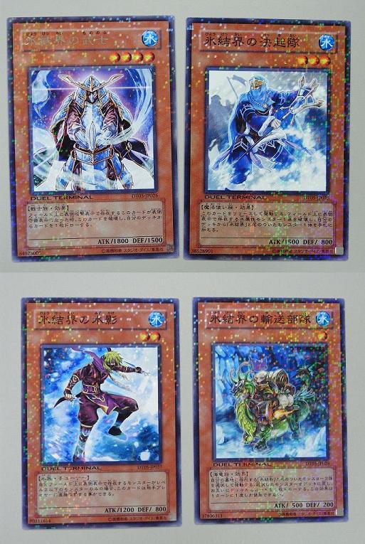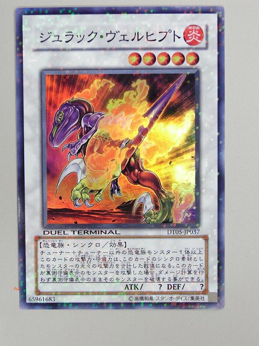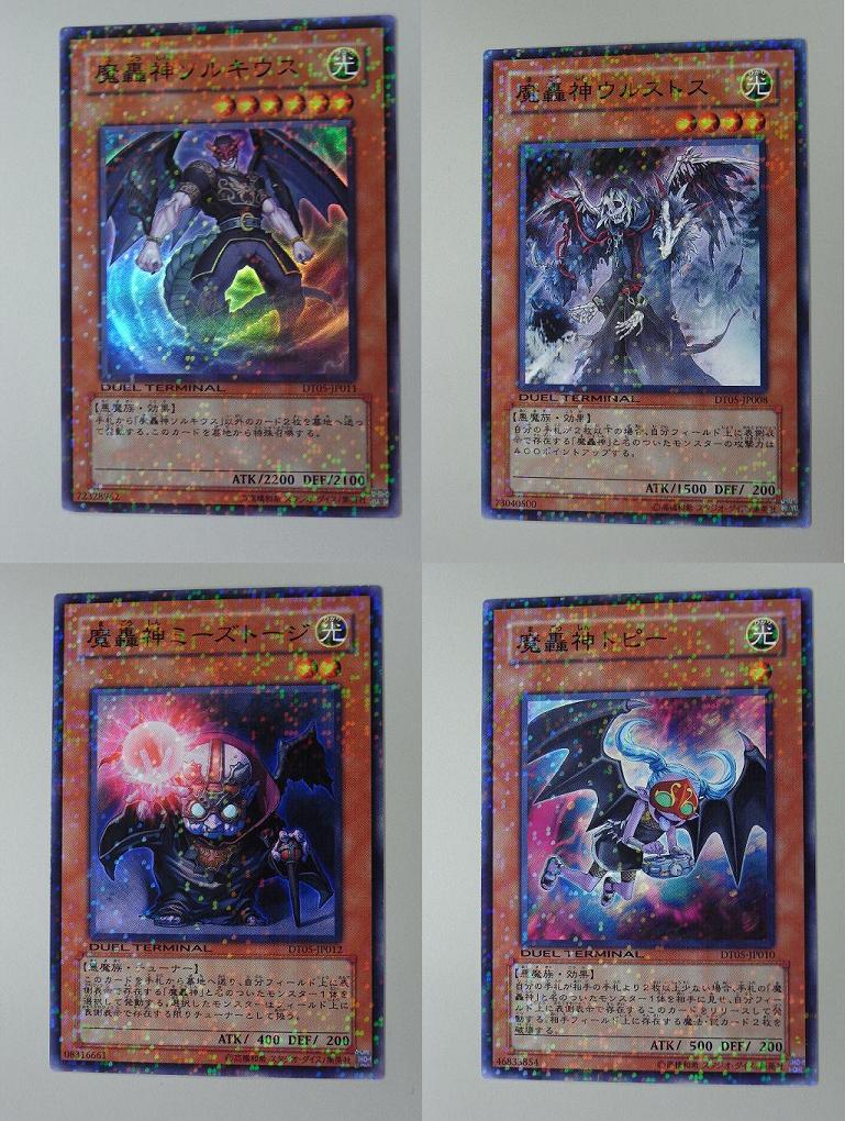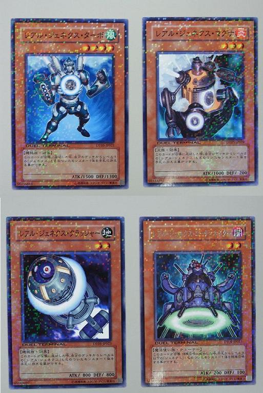 DUEL TERMINAL -混沌の覇者!! その他 2009年07月02日 さてようやく時間が取れたので今更ですがDT第5弾のカード紹介です。《魔轟神レヴュアタン》シンクロ・効果モンスター星10/光属性/悪魔族/攻3000/守2000「魔轟神」と名のついたチューナー+チューナー以外のモンスター1体以上フィールド上に存在するこのカードが破壊され墓地へ送られた時、自分の墓地に存在する「魔轟神」と名のついたモンスターを3体まで選択して発動する事ができる。選択したモンスターを手札に加える。DT第4弾で登場した魔轟神のシンクロモンスタ-なかなか強いです。ちなみにコイツは500円目で出ましたw。《魔轟神ソルキウス》 効果モンスター星6/光属性/悪魔族/攻2200/守2100手札から「魔轟神ソルキウス」以外のカード2枚を墓地へ送って発動する。このカードを墓地から特殊召喚する。手札をコストに墓地から特殊召喚できる魔轟神。《魔轟神ウルストス》 効果モンスター星4/光属性/悪魔族/攻1500/守 200自分の手札が2枚以下の場合、自分フィールド上に表側表示で存在する「魔轟神」と名のついたモンスターの攻撃力は400ポイントアップする。フィールド上の魔轟神の攻撃力を上げる効果をもつ魔轟神。《魔轟神ミーズトージ》 チューナー(効果モンスター)星2/光属性/悪魔族/攻 400/守 200このカードを手札から墓地へ送り、自分フィールド上に表側表示で存在する「魔轟神」と名のついたモンスター1体を選択して発動する。選択したモンスターはフィールド上に表側表示で存在する限りチューナーとして扱う。魔轟神のチュ-ナ-。レベル2のチューナ-は貴重ですね。《魔轟神トピー》 効果モンスター星1/光属性/悪魔族/攻 500/守 200自分の手札が相手の手札より2枚以上少ない場合、手札の「魔轟神」と名のついたモンスター1体を相手に見せ、自分フィールド上に表側表示で存在するこのカードをリリースして発動する。相手フィールド上に存在する魔法・罠カード2枚を破壊する面白い効果を持つ魔轟神。《氷結界の武士》効果モンスター星4/水属性/戦士族/攻1800/守1500フィールド上に表側攻撃表示で存在するこのカードが表側守備表示になった時、このカードを破壊し、自分のデッキからカードを1枚ドローする。氷結界のアタッカーですね。ドロー効果もあるので面白いです。《氷結界の決起隊》 効果モンスター星3/水属性/魔法使い族/攻1500/守 800このカードをリリースして発動する。フィールド上に表側表示で存在する水属性モンスター1体を破壊し、自分のデッキから「氷結界」と名のついたモンスター1体を手札に加える。《氷結界の水影》 チューナー(効果モンスター)星2/水属性/水族/攻1200/守 800自分フィールド上に表側表示で存在するモンスターがレベル2以下のモンスターのみの場合、このカードは相手プレイヤーに直接攻撃する事ができる。《氷結界の輸送部隊》 効果モンスター星1/水属性/海竜族/攻 500/守 200自分の墓地に存在する「氷結界」と名のついたモンスター2体を選択して発動する。選択したモンスターをデッキに戻し、お互いにデッキからカードを1枚ドローする。この効果は1ターンに1度しか使用できない。その他の氷結界のシリーズ達。《レアル・ジェネクス・ターボ》 効果モンスター星4/風属性/機械族/攻1500/守1300このカードが召喚に成功した時、自分のデッキからレベル1の「ジェネクス」と名のついたモンスター1体を手札に加える事ができる。《レアル・ジェネクス・マグナ》 効果モンスター星3/炎属性/炎族/攻1000/守 200このカードが召喚に成功した時、自分のデッキからレベル2の「レアル・ジェネクス」と名のついたモンスター1体を手札に加える事ができる。《レアル・ジェネクス・クラッシャー》 効果モンスター星2/地属性/機械族/攻 800/守 800このカードが召喚に成功した時、自分のデッキからレベル4の「レアル・ジェネクス」と名のついたモンスター1体を手札に加える事ができる。《レアル・ジェネクス・コーディネイター》 チューナー(効果モンスター)星2/闇属性/魔法使い族/攻 200/守 100このカードが召喚・特殊召喚に成功した時、手札からレベル3以下の「ジェネクス」と名のついたモンスター1体を特殊召喚する事ができる。ジェネクスパワーUP版レアル・ジェネクスシリーズ。《ジュラック・ヴェルヒプト》 シンクロ・効果モンスター星5/炎属性/恐竜族/攻 ?/守 ?チューナー+チューナー以外の恐竜族モンスター1体以上このカードの攻撃力・守備力は、このカードのシンクロ素材としたモンスターの元々の攻撃力を合計した数値になる。このカードが裏側守備表示のモンスターを攻撃した場合、ダメージ計算を行わず裏側守備表示のままそのモンスターを破壊する事ができる。ジュラシックシリーズのシンクロモンスター。《ナチュル・クリフ》効果モンスター星4/地属性/岩石族/攻1500/守1000このカードがフィールド上から墓地へ送られた時、自分のデッキからレベル4以下の「ナチュル」と名のついたモンスター1体を自分フィールド上に表側