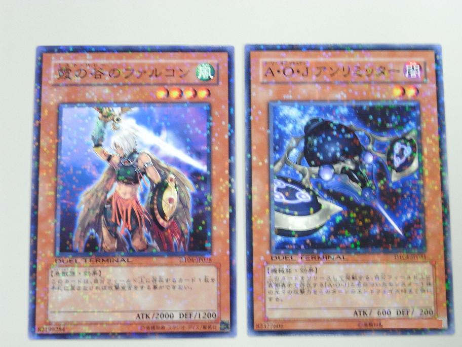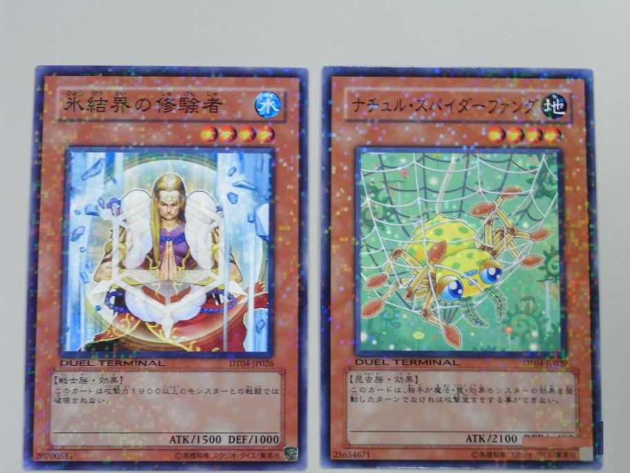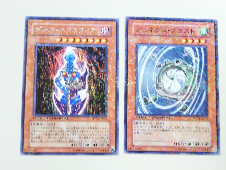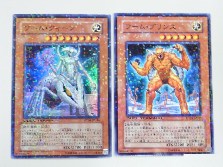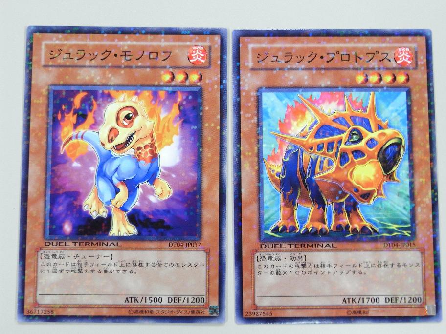 DUEL TERMINAL(デュエルターミナル) -魔轟神復活!! その他 2009年01月27日 さてDT第4弾のカ-ド紹介今回の看板でもある魔轟神から《魔轟神ルリー》 効果モンスター星1/光属性/悪魔族/攻 200/守 400このカードが手札から墓地へ捨てられた時、このカードを自分フィールド上に特殊召喚する。《魔轟神クシャノ》 チューナー(効果モンスター)星3/光属性/悪魔族/攻1100/守 800手札から「魔轟神クシャノ」以外の「魔轟神」と名のついたモンスター1体を墓地へ捨てて発動する。自分の墓地に存在するこのカードを手札に加える。2種とも中々の効果です。合わせてコンボすれば、即シンクロ召喚できますね。《ジュラック・モノロフ》 チューナー(効果モンスター)星3/炎属性/恐竜族/攻1500/守1200このカードは相手フィールド上に存在する全てのモンスターに1回ずつ攻撃をする事ができる。今回から追加された、ジュラシックのチュ-ナ-モンスタ-《俊足のギラザウルス》と合わせて召喚すればレベル6のシンクロ《ゴヨウ・ガーディアン》を即時召喚できます。また単体での能力も優秀。《ジュラック・プロトプス》 効果モンスター星4/炎属性/恐竜族/攻1700/守1200このカードの攻撃力は相手フィールド上に存在するモンスターの数×100ポイントアップする。なかなかの効果を持っています。相手フィ-ルドにモンスタ-が一体でもいれば攻撃力1800なので十分主力になるかと。《ワーム・クィーン》効果モンスター星8/光属性/爬虫類族/攻2700/守1100このカードは「ワーム」と名のついた爬虫類族モンスター1体をリリースして表側攻撃表示でアドバンス召喚する事ができる。1ターンに1度、自分フィールド上に存在する「ワーム」と名のついた爬虫類族モンスター1体をリリースする事で、リリースしたモンスターのレベル以下の「ワーム」と名のついた爬虫類族モンスター1体を自分のデッキから特殊召喚する。《ワーム・プリンス》 効果モンスター星6/光属性/爬虫類族/攻2200/守 400このカードが戦闘によって相手モンスターを破壊した場合、自分のデッキから「ワーム」と名のついた爬虫類族モンスター1体を手札に加える事ができる。自分フィールド上にこのカード以外の「ワーム」と名のついた爬虫類族モンスターが存在しない場合、エンドフェイズ時にこのカードを破壊する。ワ-ムシリ-ズの女王様と王子様です。クセがありますが使える部類かと。《霞の谷のファルコン》 効果モンスター星4/風属性/鳥獣族/攻2000/守1200このカードは、自分フィールド上に存在するカード1枚を手札に戻さなければ攻撃宣言をする事ができない。霞の谷シリ-ズのモンスタ-ちょっとあつかいづらいですかね。《A・O・J アンリミッター》 効果モンスター星2/闇属性/機械族/攻 600/守 200このカードをリリースして発動する。自分フィールド上に表側表示で存在する「A・O・J」と名のついたモンスター1体の元々の攻撃力をこのターンのエンドフェイズ時まで倍にする。A・O・Jシリ-ズのモンスタ-自身をコストに仲間のA・O・Jに《リミッター解除》の効果を付属できます。《氷結界の修験者》 効果モンスター星4/水属性/戦士族/攻1500/守1000このカードは攻撃力1900以上のモンスターとの戦闘では破壊されない。 氷結界シリ-ズのモンスタ-《翻弄するエルフの剣士》と同じ効果です。《ナチュル・スパイダーファング》 効果モンスター星4/地属性/昆虫族/攻2100/守 400このカードは、相手が魔法・罠・効果モンスターの効果を発動したターンでなければ攻撃宣言をする事ができない。ナチュルシリ-ズのモンスタ-デメリット効果付きですが、それをクリアできればアタッカ-にはなります。《スキルドレイン》で使ってあげて下さい。《ダーク・ネクロフィア》効果モンスター星8/闇属性/悪魔族/攻2200/守2800このカードは通常召喚できない。自分の墓地に存在する悪魔族モンスター3体をゲームから除外した場合に特殊召喚する事ができる。このカードが相手によって破壊され墓地へ送られた場合、そのターンのエンドフェイズ時に装備カード扱いとして相手モンスター1体に装備する。この効果で装備カード扱いになっている場合のみ、装備モンスターのコントロールを得る。入手にしくいカ-ドの復刻版です。《ジェネクス・ブラスト》 効果モンスター星4/風属性/魔法使い族/攻1600/守1300このカードが特殊召喚に成功した時、自分のデッキから「ジェネクス」と名のついた闇属性モンスター1体を手札に加える事ができる。ジュネクスシリ-ズの一体。特殊召喚すると仲間をサ-チ出来る効果を持っています。 《薔薇の刻印》 装備魔法自分の墓地に存在する植物族モンスター1体をゲームから除外して発動する。このカードを装備した相手モンスター1体のコントロールを得る。自分のエンドフェイズ時に装備モンスターのコントロールを相手に移す。自分のスタンバイフェイズ時に装備モンスターのコントロールを得る。こちらについては。前に説明しているので省きます。これでDT系は持っているものは終わりです
