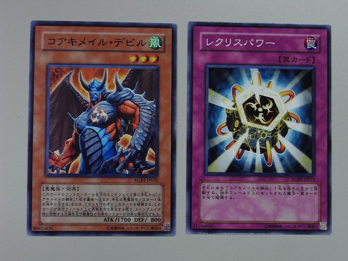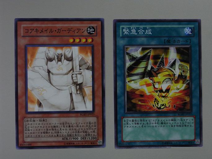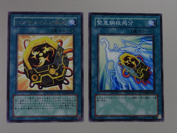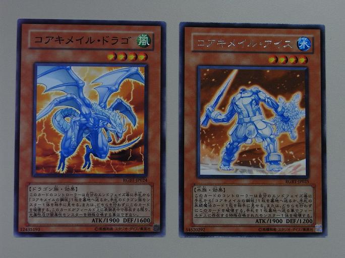 RAGING BATTLE その他 2009年03月05日 《コアキメイル・ドラゴ》 効果モンスター星4/風属性/ドラゴン族/攻1900/守1600このカードのコントローラーは自分のエンドフェイズ毎に手札から「コアキメイルの鋼核」1枚を墓地へ送るか、手札のドラゴン族モンスター1体を相手に見せる。または、どちらも行わずにこのカードを破壊する。このカードがフィールド上に表側表示で存在する限り、光属性及び闇属性モンスターを特殊召喚する事はできない。 《コアキメイル・アイス》 効果モンスター星4/水属性/水族/攻1900/守1200このカードのコントローラーは自分のエンドフェイズ毎に手札から「コアキメイルの鋼核」1枚を墓地へ送るか、手札の永続魔法カード1枚を相手に見せる。または、どちらも行わずこのカードを破壊する。手札を1枚墓地へ送る事でフィールド上に存在する特殊召喚されたモンスター1体を破壊する。《コアキメイル・デビル》 効果モンスター星3/風属性/悪魔族/攻1700/守 800このカードのコントローラーは自分のエンドフェイズ毎に手札から「コアキメイルの鋼核」1枚を墓地へ送るか、手札の悪魔族モンスター1体を相手に見せる。または、どちらも行わずにこのカードを破壊する。このカードが自分フィールド上に表側表示で存在する限り、メインフェイズ時に発動する光属性及び闇属性の効果モンスターの効果は無効化される。《レクリスパワー》 通常罠手札にある「コアキメイルの鋼核」1枚を相手に見せて発動する。相手フィールド上にセットされた魔法・罠カードを全て破壊する。《コアキメイル・ガーディアン》 効果モンスター星4/地属性/岩石族/攻1900/守1200このカードのコントローラーは自分のエンドフェイズ毎に手札から「コアキメイルの鋼核」1枚を墓地へ送るか、手札の岩石族モンスター1体を相手に見せる。または、どちらも行わずにこのカードを破壊する。効果モンスターの効果が発動した時、このカードをリリースする事でその発動を無効にし破壊する。《緊急合成》 通常魔法自分の墓地に存在する「コアキメイルの鋼核」1枚をデッキに戻して発動する。自分の手札・墓地からレベル4以下の「コアキメイル」と名のついたモンスター1体を特殊召喚する。《コアキメイルの鋼核》 通常魔法このカードが墓地に存在する場合、自分のドローフェイズ時に通常のドローを行う代わりに、このカードを手札に加える事ができる。また、自分のドローフェイズ時に手札から「コアキメイル」と名のついたモンスター1体を墓地へ送る事で、自分の墓地に存在するこのカードを手札に加える。《緊急鋼核処分》 通常魔法自分のデッキから「コアキメイルの鋼核」1枚を選択して墓地へ送る。《D・リモコン》チューナー(効果モンスター)星3/地属性/機械族/攻 300/守1200このカードはこのカードの表示形式によって以下の効果を得る。●攻撃表示:1ターンに1度、自分の墓地に存在する「D(ディフォーマー)」と名のついたモンスター1体をゲームから除外し、自分のデッキからそのモンスターと同じレベルの「D(ディフォーマー)」と名のついたモンスター1体を手札に加える。●守備表示:1ターンに1度、手札から「D(ディフォーマー)」と名のついたモンスター1体を墓地へ送り、そのモンスターと同じレベルの他の「D(ディフォーマー)」と名のついたモンスター1体を自分の墓地から手札に加える。《D・スコープン》 チューナー(効果モンスター)星3/光属性/機械族/攻 800/守1400このカードはこのカードの表示形式によって以下の効果を得る。●攻撃表示:1ターンに1度、手札からレベル4の「D(ディフォーマー)」と名のついたモンスター1体を特殊召喚する事ができる。この効果で特殊召喚したモンスターはエンドフェイズ時に破壊される。●守備表示:このカードがフィールド上に表側表示で存在する限り、このカードのレベルは4になる。《D・ビデオン》 効果モンスター星4/光属性/機械族/攻1000/守1000このカードはこのカードの表示形式によって以下の効果を得る。●攻撃表示:このカードの攻撃力はこのカードに装備された装備カードの数×800ポイントアップする。●守備表示:このカードの守備力はこのカードに装備された装備カードの数×800ポイントアップする。《D・バインド》 永続罠自分フィールド上に「D(ディフォーマー)」と名のついたモンスターが表側表示で存在する限り、相手フィールド上に存在するレベル4以上のモンスターは攻撃宣言をする事ができず、表示形式を変更する事もできない。《ダブルツールD&C》 装備魔法自分フィールド上に表側表示で存在する「パワー・ツール・ドラゴン」または「D(ディフォーマー)」と名のついたレベル4以上の機械族モンスターにのみ装備可能。それぞれのターンで以下の効果を適用する。●自分のターン:装備モンスターの攻撃力は1000ポイントアップする。装備モンスターが攻撃する場合、バトルフェイズの間だけ攻撃対象モンスターの効果は無効化される。●相手のターン:相手は装備モンスタ