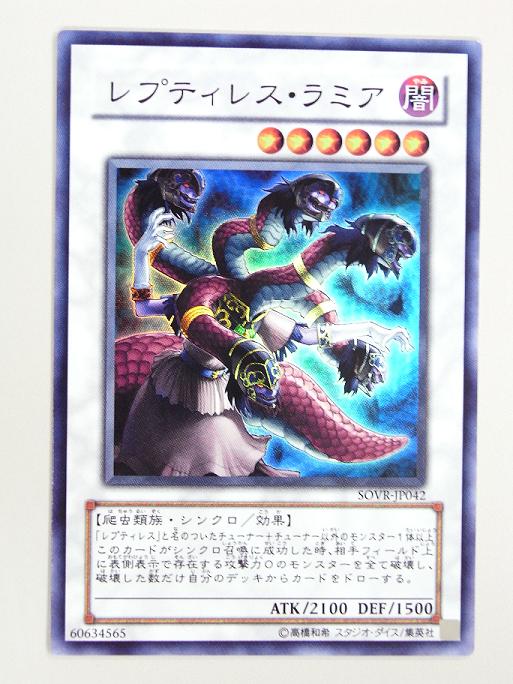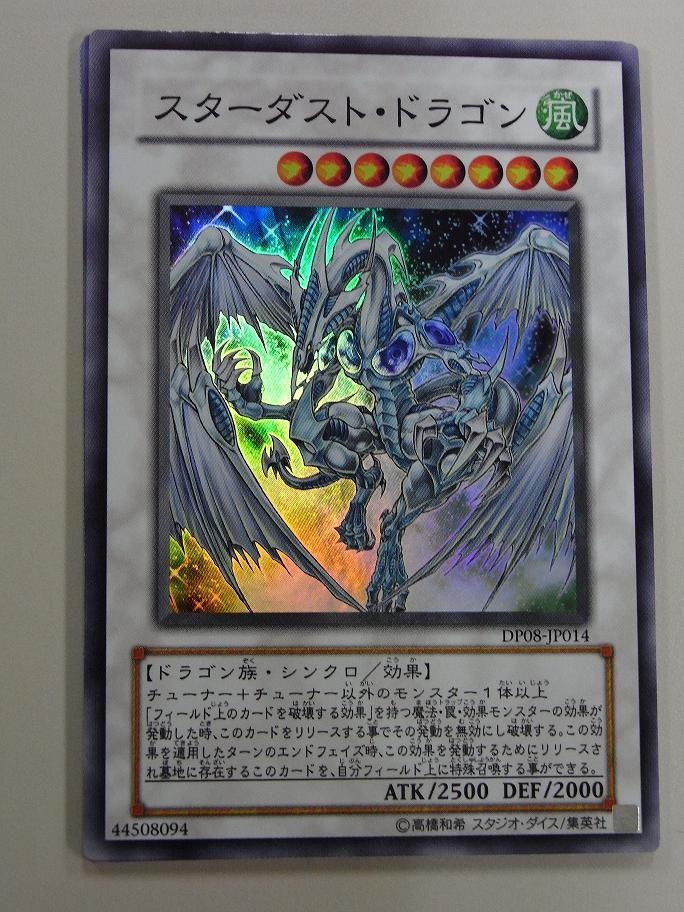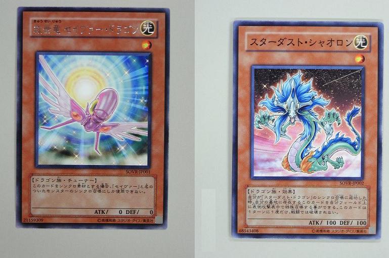 STARDUST OVERDRIVE(スターダスト・オーバードライブ) その他 2009年09月23日 さてさてOCGのブ-スターカード紹介です。SOVEです。まずは看板カードです。《セイヴァー・スター・ドラゴン》シンクロ・効果モンスター星10/風属性/ドラゴン族/攻3800/守3000「救世竜 セイヴァー・ドラゴン」+「スターダスト・ドラゴン」+チューナー以外のモンスター1体相手が魔法・罠・効果モンスターの効果を発動した時、このカードをリリースする事でその発動を無効にし、相手フィールド上のカードを全て破壊する。1ターンに1度、エンドフェイズ時まで相手の表側表示モンスター1体の効果を無効化できる。また、無効化したモンスターに記された効果をこのカードの効果として1度だけ発動できる。エンドフェイズ時にこのカードをエクストラデッキに戻し、自分の墓地に存在する「スターダスト・ドラゴン」1体を特殊召喚する。チュ-ナ-指定及び素材モンスターが一体指定となります。《救世竜 セイヴァー・ドラゴン》の力により《スターダスト・ドラゴン》がレベルUPしたもの。その効果は強力ですがエンドフェイズ時、エクストラデッキにもどる性質を持っています。《スターダスト・ドラゴン》シンクロ・効果モンスター星8/風属性/ドラゴン族/攻2500/守2000チューナー+チューナー以外のモンスター1体以上「フィールド上のカードを破壊する効果」を持つ魔法・罠・効果モンスターの効果が発動した時、このカードをリリースする事でその発動を無効にし破壊する。この効果を適用したターンのエンドフェイズ時、この効果を発動するためにリリースされ墓地に存在するこのカードを、自分フィールド上に特殊召喚する事ができる。《救世竜 セイヴァー・ドラゴン》 チューナー(効果モンスター)星1/光属性/ドラゴン族/攻 0/守 0このカードをシンクロ素材とする場合、「セイヴァー」と名のついたモンスターのシンクロ召喚にしか使用できない。《スターダスト・シャオロン》 効果モンスター星1/光属性/ドラゴン族/攻 100/守 100自分が「スターダスト・ドラゴン」のシンクロ召喚に成功した時、自分の墓地に存在するこのカードを自分フィールド上に表側攻撃表示で特殊召喚する事ができる。このカードは1ターンに1度だけ戦闘では破壊されない。《セイヴァー・スター・ドラゴン》を呼ぶ為には3枚必要になるので上記の3種を自分のカードで消費するか相手の《スターダスト・ドラゴン》を奪う形も考慮に入れるべきかな。3枚消費は大きいですからね-《クイック・シンクロン》 チューナー(効果モンスター)星5/風属性/機械族/攻 700/守1400このカードは手札のモンスター1体を墓地へ送り、手札から特殊召喚する事ができる。このカードは「シンクロン」と名のついたチューナーの代わりにシンクロ素材とする事ができる。このカードをシンクロ素材とする場合、「シンクロン」と名のついたチューナーをシンクロ素材とするモンスターのシンクロ召喚にしか使用できない。シンクロンと名の付くチューナーの代わりができるチューナーモンスター。強いし、汎用性も高いです。《レベル・スティーラー》効果モンスター星1/闇属性/昆虫族/攻 600/守 0このカードが墓地に存在する場合、自分フィールド上に表側表示で存在するレベル5以上のモンスター1体を選択して発動する。選択したモンスターのレベルを1つ下げ、このカードを墓地から特殊召喚する。このカードはアドバンス召喚以外のためにはリリースできない。墓地にあることが強みとなるカードです。結構、汎用製があるかと思います。《レプティレス・ラミア》 シンクロ・効果モンスター星6/闇属性/爬虫類族/攻2100/守1500「レプティレス」と名のついたチューナー+チューナー以外のモンスター1体以上このカードがシンクロ召喚に成功した時、相手フィールド上に表側表示で存在する攻撃力0のモンスターを全て破壊し、破壊した数だけ自分のデッキからカードをドローする。レベル6で攻撃力2100はちょっと低いですが、《おジャマトリオ》をうまく使えばダメージを与えつつ、3枚ドローのオマケが付きます。《レプティレス・ゴルゴーン》 効果モンスター星3/闇属性/爬虫類族/攻1400/守1400このカードが攻撃を行ったダメージ計算後、このカードと戦闘を行ったモンスターは攻撃力が0になり、表示形式を変更する事ができなくなる。《サベージ・コロシアム》 フィールド魔法フィールド上に存在するモンスターが攻撃を行った場合、そのモンスターのコントローラーはダメージステップ終了時に300ライフポイント回復する。このカードがフィールド上に存在する限り、攻撃可能なモンスターは攻撃しなければならない。エンドフェイズ時、ターンプレイヤーのフィールド上に表側攻撃表示で存在する攻撃宣言をしていないモンスターを全て破壊する。アニメでミスティが使用した2種のカード。使い方をミスらなければ強力なカードかと思う。《レグルス》 効果モンスター星4/光属性/獣族/攻1700/守1000自分の墓