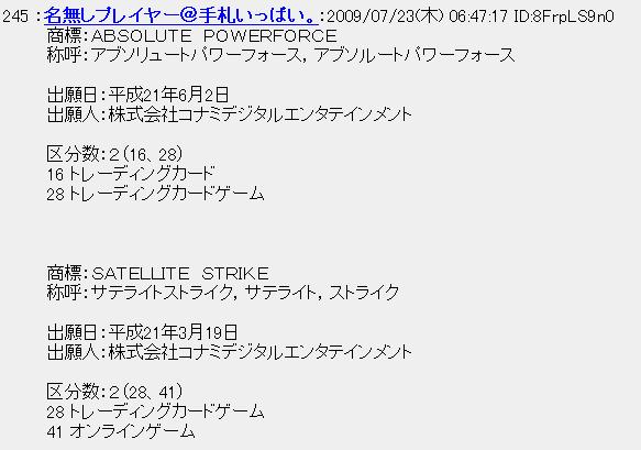 Yu-Gi-Oh! ONLINE DUELPASS SATELLITE STRIKE(?) その他 2009年07月23日 さて、某掲示板にとあることが書かれておりました。 某掲示板によると商標登録から次のOCGのブースターのことを調べている際にオンラインの新しいパスの名前らしきものも見つけられたようです。名称はSATELLITE STRIKE (サテライトストライク)と言うそうです。名前から想像するに、おそらくスターターデック2008をベースにしたデュエルパスと思われます。上記の書かれていることで申請日付が3月となっています。本来商標登録と言うのは昔であれば最短で通常一年から一年半。今現在は大部まとめられ、企業であれば大体半年ほどで登録できます。そこから推察すると現在オンラインのデュエルパスは3ヶ月ベースで発売されています。先日のPASSが7月18日、その前のドラゴンパスが4月18日です。上記の登録では申請が3月。半年で登録されるとしてOKが出るのは9月。そこから生産に入るとして約1ケ月。やはり当初から予想していた10月がシンクロの実装と考えてよいかもしれません。当然これが盛大な釣りと言うこともありますが商標登録の偽造は犯罪ですので、情報でも偽情報は罰せられます。ですのである程度は信用できる情報ではないかと思われます。もうひとつこういった情報を上げておられるブログ様もすでに見つけて、SSも取っておりますがそちらの公開については、著作権等の問題が出る可能性を見て申し訳ありませんが控えさせて頂きます。こういった情報が出てきていますのでおそらく某通販サイトにも、8月中には情報が出てくるのではないでしょうか。VJの9月、10月号にも情報が出るか如何により今後がどう展開していくか、すべてはコナミ様次第でしょう。さて真実はどうなるか。追記この記事はあくまで推測です。予想ですので実際真実となるかは分かりません。とりあえずSTARTER DECK(2008)のリストをUPして置きます。モンスターカード 19枚通常モンスター 9枚《チューン・ウォリアー》1(未実装)(チューナー)《ウォーター・スピリット》1 (未実装)(チューナー)《アックス・レイダー》1 《闇魔界の戦士 ダークソード》1 《大木炭18》1 《ハーピィ・ガール》1 《スパイラルドラゴン》1 《暗黒界の番兵 レンジ》1 《海皇の長槍兵》1 効果モンスター 10枚《ロードランナー》1(未実装)《ジャンク・シンクロン》1(未実装)(チューナー)《スピード・ウォリアー》1(未実装) 《炎龍》1(未実装)(チューナー)《マジカルフィシアリスト》1(未実装)《ものマネ幻想師》1 《UFOタートル》1 《キラー・トマト》1 《切り込み隊長》1 《ならず者傭兵部隊》1(テキスト訂正あり) 魔法カード 12枚《シンクロ・ヒーロー》1(未実装)《精神同調波》1(未実装)《コモンメンタルワールド》1(未実装)《治療の神 ディアン・ケト》1 《火炎地獄》1 《降格処分》1 《死者転生》1 《ライトニング・ボルテックス》1 《ツイスター》1 《トルネード》1 《二重召喚》1 《戦線復活の代償》1 罠カード 9枚《くず鉄のかかし》1(未実装)《ミニチュアライズ》1(未実装) 《六芒星の呪縛》1 《補充要員》1 《落とし穴》1 《炸裂装甲》1 《天罰》1 《ゴブリンのやりくり上手》1 《正統なる血統》1シンクロモンスター 3枚《ジャンク・ウォリアー》1(未実装) 《大地の騎士ガイアナイト》1(未実装) 《ギガンテック・ファイター》1(未実装) PR