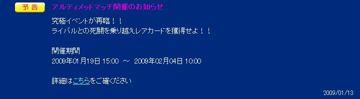 第2回 アルティメット・マッチ アルティメット・マッチ 2009年01月13日 さて、いよいよ公式にてアルティメット・マッチが発表されました。期間は1月19日の15時~2月4日の午前10時まで。前回より一日多い16日間。景品は上記の通り☆10《オーシャンズ・オーパー》 ☆20《マザー・ブレイン》 ☆30《深海王デビルシャーク》 ☆40《サウザンド・アイズ・フィッシュ》 ☆50《モーム》 ☆60《炎妖蝶ウィルプス》 ☆70《デュアル・サモナー》 ☆80《旧神の印》☆90《マキシマム・シックス》 ☆100《デンジャラスマシン TYPE-6》 とりあえず、今回はメインID1本でアルマは進んでいこうと思います。一気にダッシュを駆けて、TPを稼いで行きます。最低ノルマはマッチ200勝です。 PR