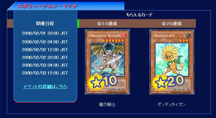 エボリューション・マッチ 第1回 (EVO) エボリューション・マッチ 2008年02月01日 ☆10《竜の騎士》 ☆20《ダンディライオン》 さていよいよ今夜からエボリュ-ションマッチが開催されます。廃盤パック等も空けることができるのか。公式の説明では勝ち負けどちらでも通常パックと言うことらしいですが、フタを空けるまではわからないのですこしぐらいは期待してみたい。デッキについては普段からサイドデッキまで考えて作っているのであまり問題ないだろう。 PR