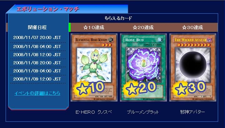 エボリューション・マッチ 第15回、第16回 エボリューション・マッチ 2008年10月23日 ☆10《E・HERO クノスペ》 ☆20《ブルーメンブラット》☆30《邪神アバター》 さて最後はエボの景品について☆10《E・HERO クノスペ》効果モンスター星3/地属性/植物族/攻 600/守1000相手プレイヤーに戦闘ダメージを与える度に、このカードの攻撃力は100ポイントアップし、守備力は100ポイントダウンする。このカードを除く「E・HERO」と名のついたモンスターが自分フィールド上に表側表示で存在する限り、相手はこのカードを攻撃対象に選択できず、このカードは相手プレイヤーに直接攻撃する事ができる。一言、かわいそうなので一度は呼んであげてください。☆20《ブルーメンブラット》通常魔法自分フィールド上の「E・HERO クノスペ」1体を生け贄に捧げて発動する。自分の手札またはデッキから「E・HERO ブルーメ」1体を特殊召喚する。はい、《E・HERO ブルーメ》が手に入らなければ唯の紙です。☆30《邪神アバター》効果モンスター星10/闇属性/悪魔族/攻 ?/守 ?このカードは特殊召喚できない。自分フィールド上に存在するモンスター3体を生け贄に捧げた場合のみ通常召喚する事ができる。このカードが召喚に成功した場合、相手ターンで数えて2ターンの間、相手は魔法・罠カードを発動できない。このカードの攻撃力・守備力は、フィールド上に表側表示で存在する「邪神アバター」を除く、攻撃力が一番高いモンスターの攻撃力+100ポイントの数値になる。《邪神アバター》どう見てもこっちが7連景品だと思う。《邪神ドレッド・ルート》との差があまりにひどいこっちの方が強いのにカワイソス。さて、景品こんなんばっかですが頑張らないとな、ここでTPのマ-ジン稼いでおきたいです。 PR