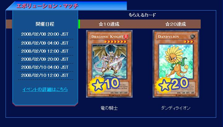 エボリューション・マッチ 第2回 (EVO) エボリューション・マッチ 2008年02月08日 ☆10《竜の騎士》 ☆20《ダンディライオン》さてエボリューション・マッチ2周目。すでに10SETあるので適当に行きます。しかしTPは稼げる時に稼がないと油断しているとあっという間に圏外へ。 PR