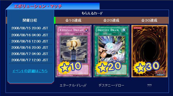 エボリューション・マッチ 第10回 夜の部④ エボリューション・マッチ 2008年07月27日 ①○相手鯖 闇スタン ②○×○ 暗黒界(ダム)③×○○ 暗黒界 ④×○○ 六武衆 ⑤○○ 剣闘獣 ⑥×○○ ヴォルカニック⑦○×○ 黄泉帝 ⑧×○× 闇スタン つづきはこちら