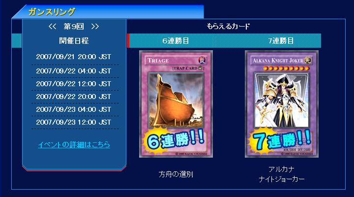 ガンスリング 第17回、第18回 ガンスリング 2007年09月10日 次期ガンスリングも発表。ようやく来たか言う感じですか。これで4期ガンスはストラクとデュエリストパック以外は程出たということか。またいろいろ言われてますが充分神ガンスだと私は思う。6連勝 《方舟の選別》 7連勝 《アルカナ ナイトジョーカー》 PR