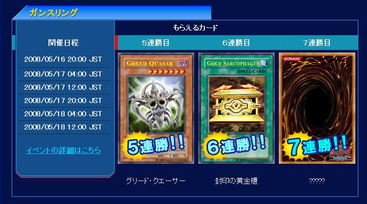 ガンスリング 第31回、第32回(EVO) ガンスリング 2008年05月08日 5連勝《グリード・クエーサー》6連勝《封印の黄金櫃》7連勝?????さて、ガンスリングなのですが今回から5連が復活。そして7連景品が不明。それはいい。ここであえて言おう。コンマイ~~何を考えている。《封印の黄金櫃》を6連景品にするか。《死霊ゾーマ》に次ぐ最強の6連です。ガンスリングは廃人プレイが確定しました。7連についてはおそらく《ネクロフェイス》かと思われます。 PR