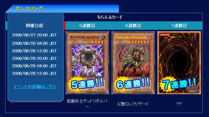 ガンスリング 第33回、第34回 ガンスリング 2008年06月16日 5連勝《起動兵士デッドリボルバー》6連勝《幻獣ロックリザード》 7連勝??? さてガンスリングも更新。前回ほどきつくはならないかも景品が景品だし。まあ7連は流れで行くと《古代の機械巨竜》大穴で《ネクロフェイス》と言ったところでしょう。5連勝《起動兵士デッドリボルバー》効果モンスター星4/地属性/機械族/攻 0/守2000自分フィールド上に「ガジェット」と名のついたモンスターが表側表示で存在する限り、このカードの攻撃力は2000ポイントアップする。6連勝《幻獣ロックリザード》効果モンスター星7/闇属性/獣戦士族/攻2200/守2000「幻獣」と名のついたモンスターを生け贄に捧げる場合、このカードは生け贄1体で召喚する事ができる。このカードが戦闘で破壊したモンスター1体につき、相手ライフに500ポイントダメージを与える。相手がコントロールするカードの効果によってこのカードが破壊され墓地へ送られた時、相手ライフに2000ポイントダメージを与える。7連勝(予定)《古代の機械巨竜》 効果モンスター星8/地属性/機械族/攻3000/守2000このカードが攻撃する場合、相手はダメージステップ終了時まで魔法・罠カードを発動できない。 以下のモンスターを生け贄にして生け贄召喚した場合、このカードはそれぞれの効果を得る。●グリーン・ガジェット:このカードが守備表示モンスターを攻撃した時、このカードの攻撃力が守備表示モンスターの守備力を超えていれば、その数値だけ相手ライフに戦闘ダメージを与える。●レッド・ガジェット:相手プレイヤーに戦闘ダメージを与えた時、相手ライフに400ポイントダメージを与える。●イエロー・ガジェット:戦闘によって相手モンスターを破壊した場合、相手ライフに600ポイントダメージを与える。7連勝(大穴)《ネクロフェイス》 効果モンスター(準制限カード)星4/闇属性/アンデット族/攻1200/守1800このカードが召喚に成功した時、ゲームから除外されているカード全てをデッキに戻してシャッフルする。このカードの攻撃力はこの効果でデッキに戻したカードの枚数×100ポイントアップする。このカードがゲームから除外された時、お互いはデッキの上からカードを5枚ゲームから除外する。 PR