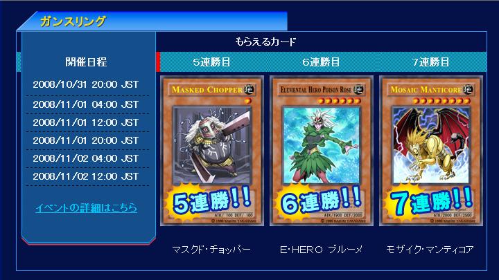 ガンスリング 第39回、第40回 ガンスリング 2008年10月23日 5連勝《マスクド・チョッパー》6連勝《E・HERO ブルーメ》7連勝《モザイク・マンティコア》 さてガンスリングの景品の内容について5連勝《マスクド・チョッパー》効果モンスター星1/地属性/悪魔族/攻 100/守 100このカードが戦闘によって相手モンスターを破壊した場合、相手ライフに2000ポイントダメージを与える。正直に一言、使えません。6連勝《E・HERO ブルーメ》効果モンスター星6/地属性/植物族/攻1900/守2000このカードは通常召喚できない。このカードは「ブルーメンブラット」の効果でのみ特殊召喚する事ができる。相手は「E・HERO ブルーメ」しか攻撃対象に選択できない。相手プレイヤーに戦闘ダメージを与える度に、このカードの攻撃力は200ポイントアップし、守備力は200ポイントダウンする。さて、こちらもそこそこ能力はありますが使い勝手が悪いです。7連勝《モザイク・マンティコア》効果モンスター星8/地属性/獣族/攻2800/守2500このカードが生け贄召喚に成功した場合、次の自分ターンのスタンバイフェイズ時に、このカードの生け贄召喚に使用した墓地に存在するモンスターを自分フィールド上に特殊召喚する。この効果で特殊召喚されたモンスターは攻撃宣言をする事ができない。この方法で特殊召喚されたモンスターのモンスター効果は無効化される。さて7連カ-ドです。そこそこ使えます。上級デッキに入れてもいいかなと言うレベルですか。そこそこの価値になると思われます。 PR
