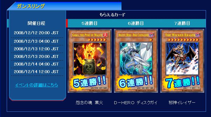 ガンスリング 第41回、第42回 ガンスリング 2008年12月01日 5連勝《怨念の魂 業火》 6連勝《D-HERO ディスクガイ》7連勝《邪神イレイザー》 次はガンスリング5連勝《怨念の魂 業火》 効果モンスター星6/炎属性/アンデット族/攻2200/守1900自分フィールド上に炎属性モンスターが存在する場合、このカードは手札から特殊召喚する事ができる。この方法で特殊召喚に成功した場合、自分フィールド上の炎属性モンスター1体を破壊する。自分のスタンバイフェイズ時に、自分フィールド上に「火の玉トークン」(炎族・炎・星1・攻/守100)を1体守備表示で特殊召喚する。自分フィールド上のこのカード以外の炎属性モンスター1体を生け贄に捧げる事で、このターンのエンドフェイズ時までこのカードの攻撃力は500ポイントアップする。6連勝《D-HERO ディスクガイ》効果モンスター(禁止カード)星1/闇属性/戦士族/攻 300/守 300このカードが墓地からの特殊召喚に成功した時、自分のデッキからカードを2枚ドローする。7連勝《邪神イレイザー》効果モンスター星10/闇属性/悪魔族/攻 ?/守 ?このカードは特殊召喚できない。自分フィールド上に存在するモンスター3体を生け贄に捧げた場合のみ通常召喚する事ができる。このカードの攻撃力・守備力は、相手フィールド上に存在するカードの枚数×1000ポイントの数値になる。このカードが破壊され墓地へ送られた時、フィールド上のカードを全て破壊する。自分フィールド上に表側表示で存在するこのカードを破壊する事ができる。さてガンスリングの景品紹介。まずは5連勝《怨念の魂 業火》。漫画版GXにおいて三沢くんが使用していたカ-ドそこそこ使えるカ-ドです。まあデッキを選んで使う形ですが。そして7連勝を押さえ今回の目玉と言うべき6連勝《D-HERO ディスクガイ》です。まあようやくと言うか、つ-か遅えよ。リアルでは既に禁止となっているこのカ-ド。おそらく精々生き延びて半年くらいです。コンマイはバカなので《封印の黄金櫃》の時と同じ過ちを繰り返してくれました。《封印の黄金櫃》のガンスの時以上の過酷なガンスリングとなるでしょう。あとはPCのスペックも必要かなロビ-が1000人行くんじゃないんでしょうか。最後は7連勝、残り邪神の一体。《邪神イレイザー》です。漫画版では、バンテッド・キ-スが使用したこのカ-ド、さすが邪神といわれるだけの効果もちです。《邪神ドレッド・ルート》と同じ7連勝の扱いです。通称●と言われている 《邪神アバター》の方が遥かに強いのにw、《邪神アバター》哀れなり。 PR