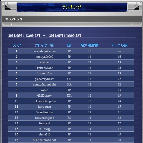 YO3 ガンスリング 第16回 昼の部③ ガンスリング 2011年05月14日 昼に取ったのはいつ以来だろうか。 参加する時間が遅かったので12連目には届きませんでした。12連で☆が1周するので次頑張ろう。ランキングの上の方に載ったのも久しぶりですねー。11連目は最後で故意の切断くらいました。鯖の調子が悪いならしかたありませんけど明らかに故意でしたからねー。アカデミアの青服着てるんだからLV20以上ですねー。情けない限りです。 PR