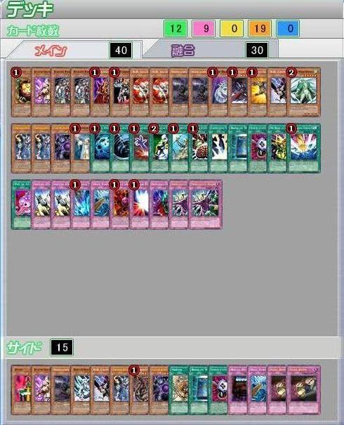 アサイカリバー Ver2.0 デッキレシピ 2009年06月10日 デッキ詳細モンスター 19枚《D.D.クロウ》、《クリッター》《冥府の使者ゴーズ》、《ライオウ》2 《死霊騎士デスカリバー・ナイト》2《D.D.アサイラント》2、《ならず者傭兵部隊》2《異次元の女戦士》、《サイバー・ドラゴン》 《N・グラン・モール》、《魔導戦士 ブレイカー》 《邪帝ガイウス》、《風帝ライザー》 《霊滅術師 カイクウ》、《ライトロード・マジシャン ライラ》魔法 12枚《大嵐》、《サイクロン》、《早すぎた埋葬》《洗脳-ブレインコントロール》 《貪欲な壺》, 《地砕き》、《ライトニング・ボルテックス》《月の書》、《エネミーコントローラー》《我が身を盾に》、《抹殺の使途》、《増援》罠 9枚《激流葬》,《死のデッキ破壊ウイルス》《奈落の落とし穴》、《神の宣告》2《次元幽閉》2、、《砂塵の大竜巻》《聖なるバリア-ミラーフォース-》サイドデッキ 15枚《ライオウ》、《霊滅術師 カイクウ》 《死霊騎士デスカリバー・ナイト》《氷帝メビウス》、《D.D.クロウ》《人造人間-サイコ・ショッカー》 《ダーク・アームド・ドラゴン》《邪帝ガイウス》、《収縮》《月の書》、《エネミーコントローラー》《王宮のお触れ》、《砂塵の大竜巻》《魔宮の賄賂》2さて、久しぶりにアサイカリバーをいじってみました。未実装が無くなってきたので前から入れたかったカードを入れて調整サイドから3枚に変えることも一部できるようにしました。あとはバ-ン対策のみを施してみました。まだまだ調整中といった感じです。 PR