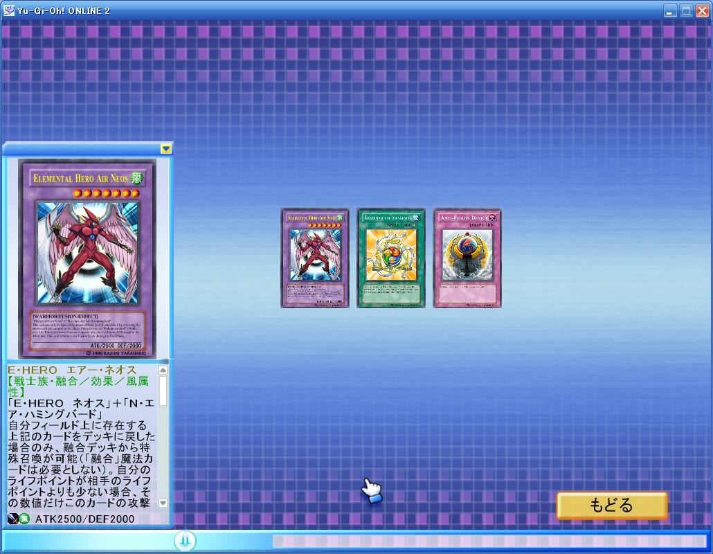デュエリスト・トライアル 第11回(EVO) 夜の部① トライアル 2007年06月23日 ×○×○○××○×○○○×××○○×○○○○○○ ○○ 辛うじて3周といった所か。帝対策に《死のデッキ破壊ウイルス》の媒介を軸にしたトマハンベ-スのデッキではやはりパワ-負けの帰来がある。《死のデッキ破壊ウイルス》も状況次第では手札のこやしになり始めている。やはり《D.D.クロウ》を軸に練り直した方がよさそうだ。10勝目からはアンデットに切り替えた。アンデットも一様《死のデッキ破壊ウイルス》の媒介はあるが、アンデットの場合は、硬さを武器にし、隙あらば、《生者の書》で《黄泉ガエル》を除外するデッキ戦術で回すべきだろう。とりあえず、引き続き、トマハンとアンデットで調整を試みるか。サイドラベ-スも調整しなければいかんが。TP 170P戦利品(廃盤パックを含む)《神剣-フェニックスブレード》 3枚《サイレント・ソードマン LV7》 3枚《ドラゴンを呼ぶ笛》 1枚《E・HERO エアー・ネオス》 1枚《暗黒界の魔神 レイン》 1枚 PR