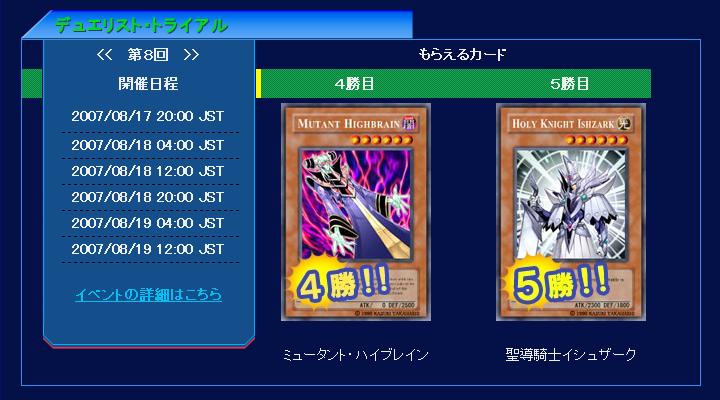 デュエリスト・トライアル 第15回(EVO) トライアル 2007年08月17日 さて今日はトライアルですが明日は、出勤の為、3回しか出れません。休みとってやろうか、有給38日ぐらいあるし。4勝目 《ミュータント・ハイブレイン》 5勝目 《聖導騎士イシュザーク》 PR