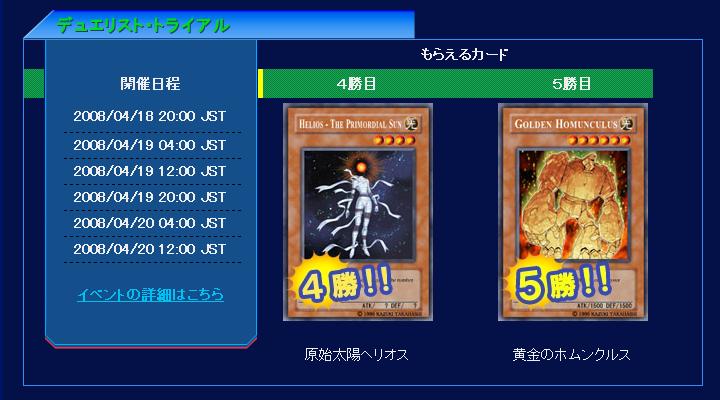 デュエリスト・トライアル 第30回(EVO) トライアル 2008年04月17日 4勝目《原始太陽ヘリオス》 5勝目《黄金のホムンクルス》シ-ズン終了まであと3週間。消化試合のような感じだが制限改訂に向け調整がてら行ってみます。 PR