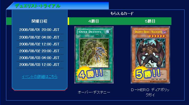 デュエリスト・トライアル 第35回 トライアル 2008年08月01日 4勝目《オーバー・デステニー》 5勝目《D-HERO ディアボリックガイ》 さてトライアルです。ですが明日の昼の部が出られません。TP稼ぎたいのにorz。がんばって朝起きて見ようかと思います。 PR