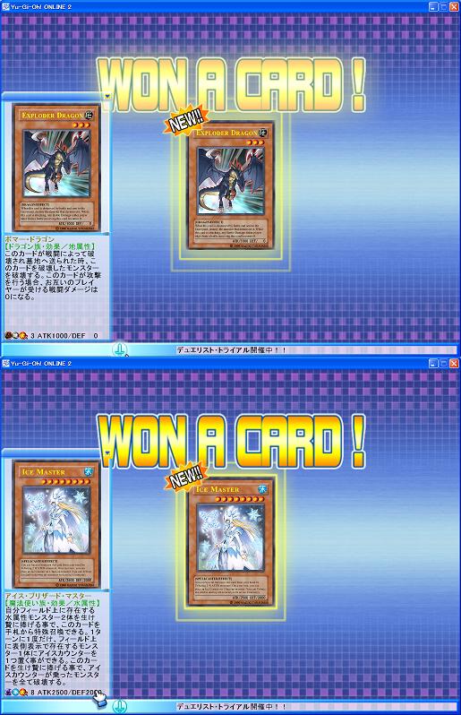 デュエリスト・トライアル 第41回 夜の部① トライアル 2008年12月06日 ××○×○○×○○×○○×○○○○○○○××○使用デッキライトロ-ド某所より2戦あとは家に帰ってから。ノルマの3周はクリアしました。戦利品《ボマー・ドラゴン》3枚 《アイス・ブリザード・マスター》3枚 PR