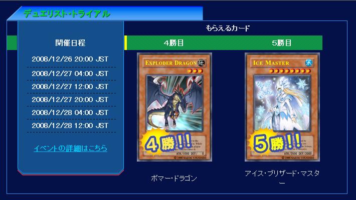 デュエリスト・トライアル 第42回 トライアル 2008年12月26日 4勝目《ボマー・ドラゴン》 5勝目《アイス・ブリザード・マスター》 諸事情により金曜日及び土曜日の夜の部まで出られません。出る方々は頑張って下さい。 PR