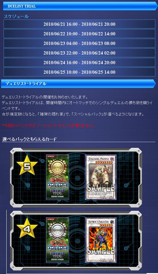 YO3 デュエリスト・トライアル 第1回 トライアル 2010年06月18日 ☆4《大地の騎士ガイアナイト》 ☆5《ギガンテック・ファイター》 さて公式でトライアルの日程が発表されました。現状は6/21~6/25の平日です。リーマンなお兄さんは水曜の夜しか出れません。以下景品です。☆4《大地の騎士ガイアナイト》 シンクロモンスター星6/地属性/戦士族/攻2600/守 800チューナー+チューナー以外のモンスター1体以上☆5《ギガンテック・ファイター》シンクロ・効果モンスター星8/闇属性/戦士族/攻2800/守1000チューナー+チューナー以外のモンスター1体以上このカードの攻撃力は墓地に存在する戦士族モンスターの数×100ポイントアップする。このカードが戦闘によって破壊され墓地に送られた時、墓地に存在する戦士族モンスター1体を選択し自分フィールド上に特殊召喚する事ができる。細かい説明はあえて省きます。今までと違うのは景品に高い金が必要なことですね。カードでありますが、パックという形式をとっています。あとはパック取得に有効期限があることですね。本当にぼったくりだな。もう少し敷居さげてやれよ。子供がメインと思うのだがなあー。まあ後で損するのはコンマイだしせいぜい叩かれて下さい。それで更生すればよしです。 PR