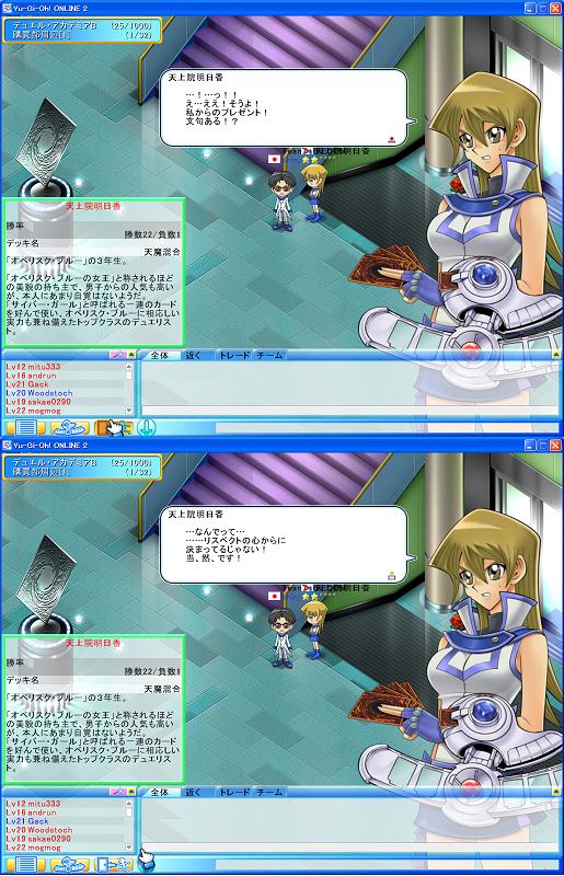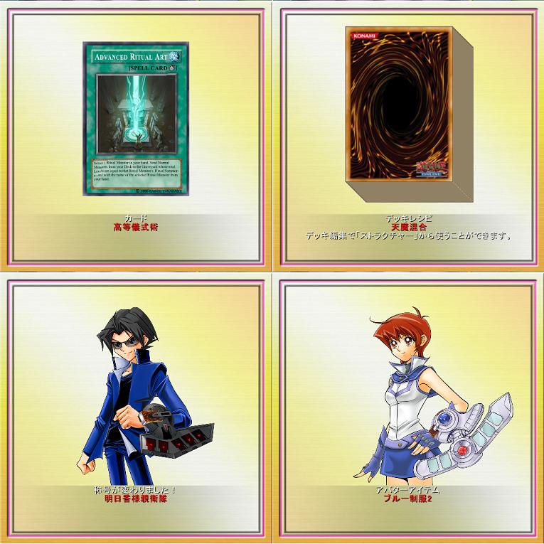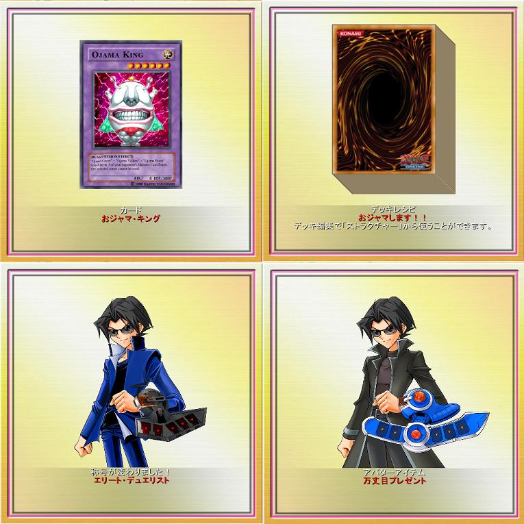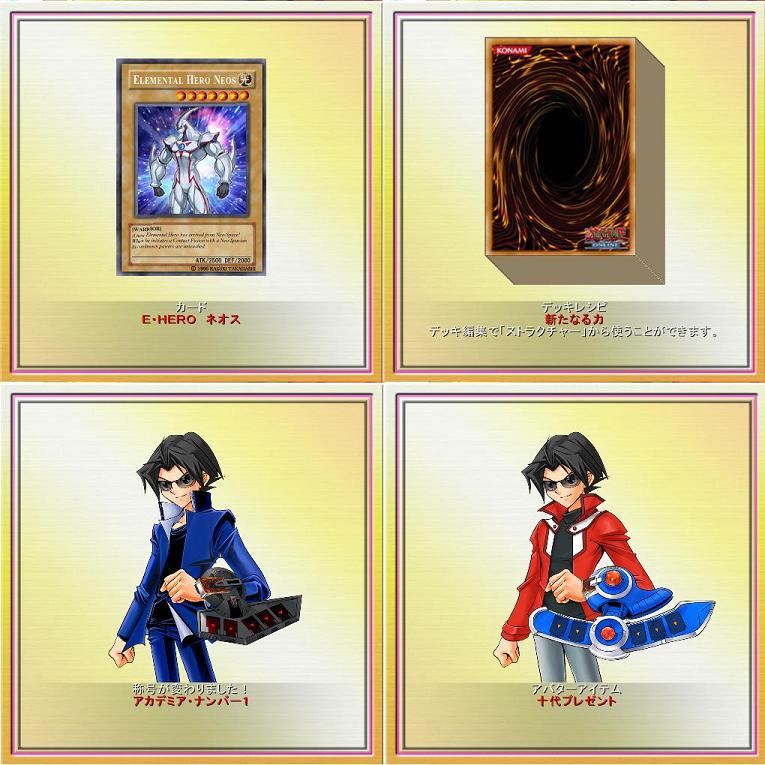 CPU対戦日記⑯ CPU 2008年09月16日 アカデミア側32 遊戯十代(原作キャラ) レッド寮周辺デッキ名 E・HERO見参9勝目から E・HERO達の結束18勝目から 新たなる力もらえるカ-ド5勝目 《ダーク・カタパルター》17勝目《E・HERO シャイニング・フレア・ウィングマン》22勝目《E・HERO ネオス》もらえるデッキレシピ7勝目 E・HERO 見参!17勝目 E・HEROの結束 25勝目 新たなる力もらえるアバタ-アイテム 十代プレゼント(男性用)もらえる称号アカデミア・ナンバ-1 勝敗 ×○○○○○ ○○○ ○○○○○○○○○ ○○○○○○○○さてしばらく放置していたCPU対戦を進めていきたいと思います。まずは十代。もうすこしチ-トして下さい。33 万丈目準(原作キャラ)デュエル場 デッキ名 変形合体!!9勝目から レベルアップの恐怖21勝目から おジャマします!!もらえるカ-ド5勝目 《VWXYZ-ドラゴン・カタパルトキャノン》14勝目《アームド・ドラゴン LV7》26勝目《おジャマ・キング》もらえるアバタ-アイテム 万丈目プレゼント(男性用)もらえる称号エリ-ト・デュエリスト勝敗 ○○○○○ ○×○○×○○○○○×○○×○○○○○○○○○お次は万丈目サンダ-キミも《光と闇の竜》をデッキに入れてチ-トして下さい。34 天上院明日香(原作キャラ) 購買部周辺デッキ名 サイバ-・ガ-ル9勝目から サイバ-・ガ-ル218勝目から 天魔混合もらえるカ-ド5勝目 《エトワール・サイバー》13勝目 《サイバー・ブレイダー》 22勝目 《高等儀式術》もらえるデッキレシピ7勝目 サイバー・ガール17勝目 サイバー・ガール226勝目 天魔混合もらえるアバタ-アイテム ブルー制服2(女性用)もらえる称号明日香様親衛隊勝敗 ○○○○○ ○○○○○× ○○○○○○○ ○○○○○○○○○最後は明日香さんデミス、ゾ-ク、シナトと天魔神入れたチ-トデッキですがまだ足りませんな。《思い出のブランコ》でも入れてきて下さい。明日香さんはツンデレなので、最後にこんなこと言ってくれます。明日香のツンデレ度合はツン7デレ3くらいでいいのだろうか。さて次はほっぽていたエドの坊やを今度こそやってみます。 PR
