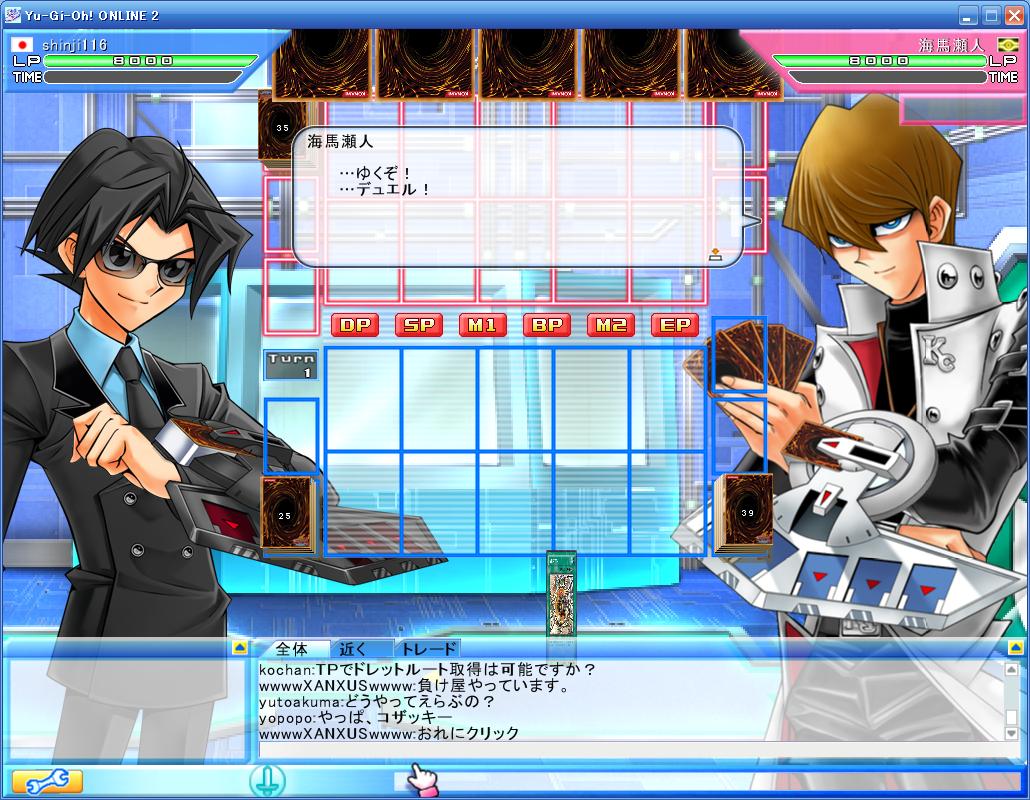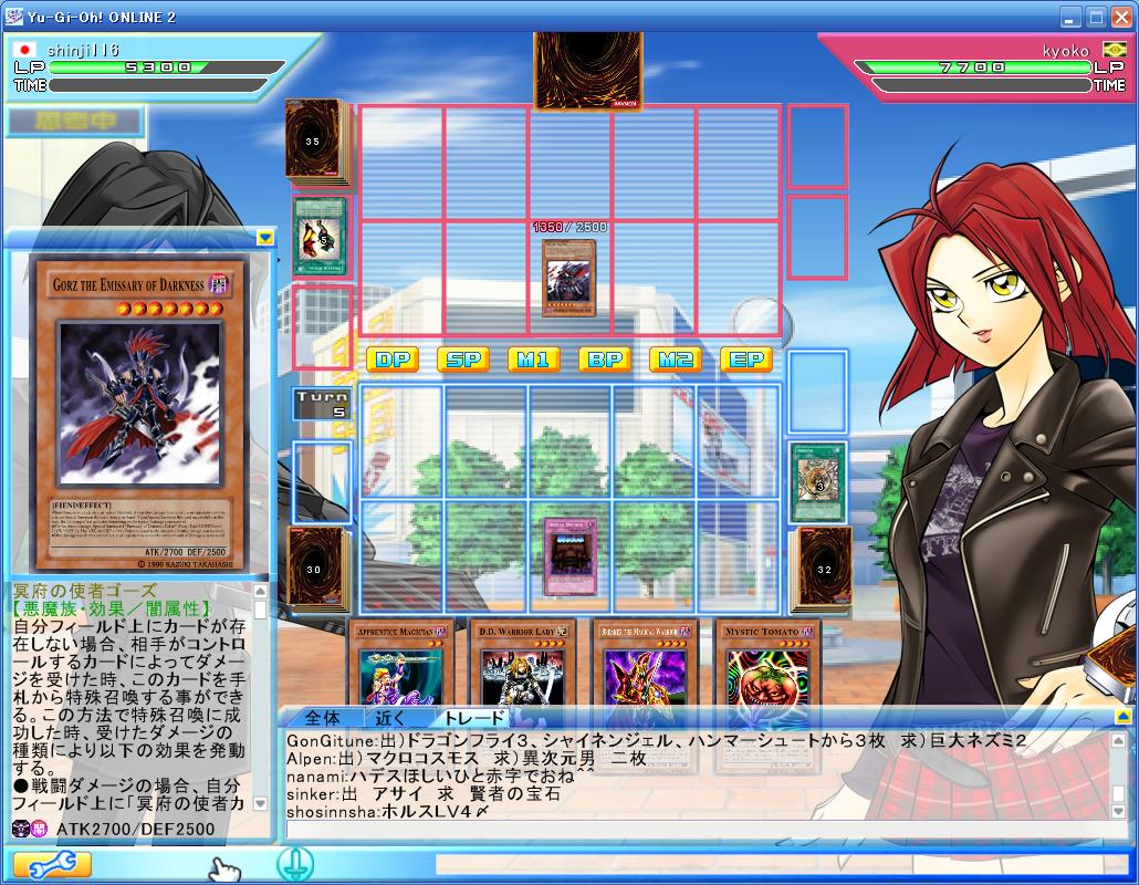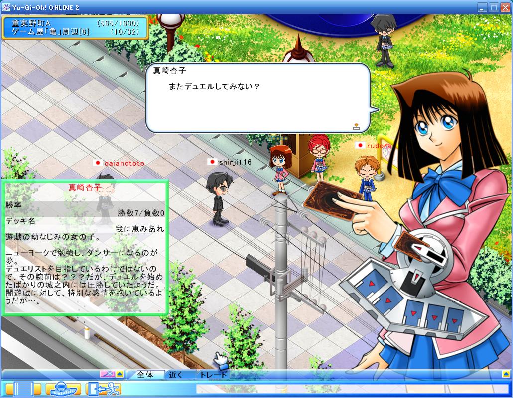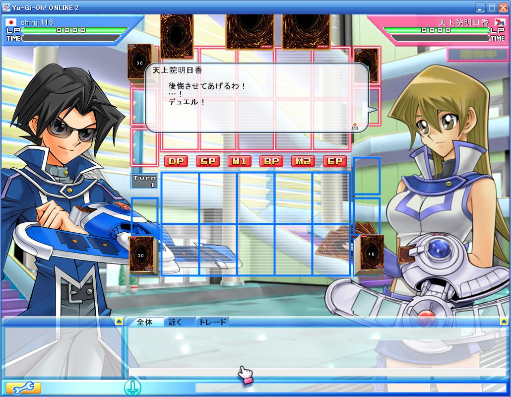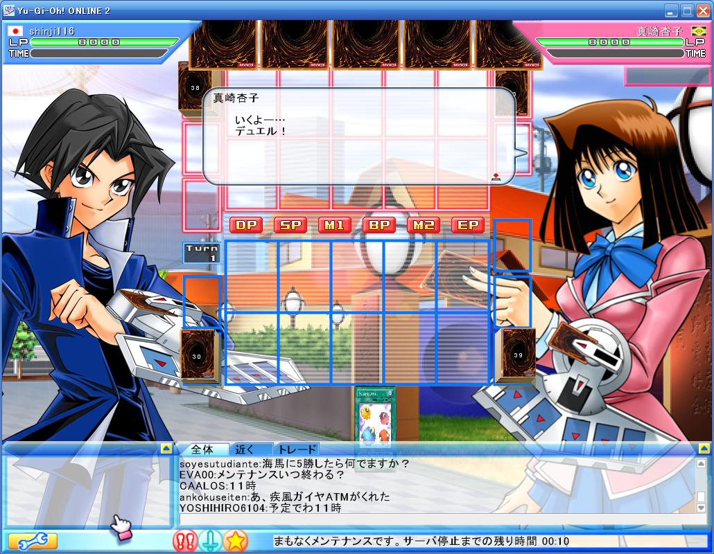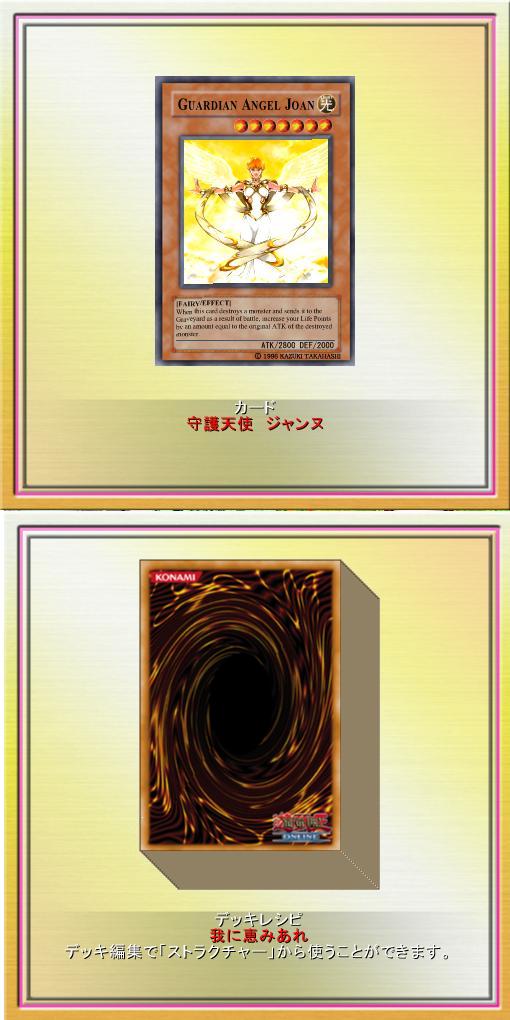 CPU対戦日記① CPU 2007年09月09日 問題山積みなCPU対戦とりあえず対戦日記付けてみる事に。まずは昨日と今日の2日分ドミノ町①Miss Scout(女性)亀屋周辺デッキ名 黒蠍のお仕事黒蠍団のハンデスデッキ勝敗 ○○○○○ ○○○○5勝目 アバタ-アイテム サングラス(女性用) もらえるカ-ド《首領・ザルーグ》 海馬瀬人への挑戦権9勝目 デッキレシピ 黒蠍のお仕事②KC Dragon(男性)KC前デッキ名 ホルス-ドラゴン勝敗 ○○○○×○ ○×○○5勝目 アバタ-アイテム 黒服ス-ツ(男性用) もらえるカ-ド 《ホルスの黒炎竜 LV8》 海馬瀬人への挑戦権8勝目 デッキレシピ ホルス-ドラゴン③Joker(男性)KC前デッキ名 天使か?悪魔か!?儀式デッキ勝敗 ○×○○×○○○○○5勝目 アバタ-アイテム 紅白ジャージ(男性用) もらえるカ-ド 《大天使ゼラート》 ④gouk(男性)KC前デッキ名 魔法のない世界勝敗 ○××○○○○5勝目 アバタ-アイテム サングラス(男性用) もらえるカ-ド《マジック・キャンセラー》 海馬瀬人への挑戦権⑤missbomb(女性)亀屋周辺デッキ名 死にいたる黒蛇病勝敗 ○⑥真崎杏子(原作キャラ)亀屋周辺デッキ名 我に恵みあれ10勝目から 天使達の裁き 勝敗 ○○○○○○○ ○○○○○○5勝目 アバタ-アイテム なし もらえるカ-ド《守護天使 ジャンヌ》原作キャラ1戦目は杏子ちゃんでした。最初のデッキはキュアバ-ン10勝目からは天使パ-ミションへとデッキが変わります。↑もらえるカ-ドとデッキレシピ。アカデミア側は次の記事にて