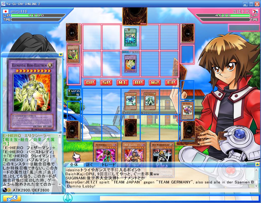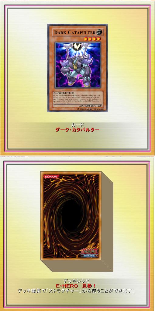 CPU対戦日記② CPU 2007年09月10日 アカデミア側の対戦日記①Aoj(女性)レッド寮周辺デッキ名 アタッカ-歓迎 チェ-ンバ-ン+ウォ-ルバ-ン勝敗 ○×○×○○○5勝目 アバタ-アイテム 無し もらえるカ-ド 《ディメンション・ウォール》 天上院明日香への挑戦権②遊戯十代(原作キャラ) レッド寮周辺デッキ名 E・HERO見参9勝目から E・HERO達の結束もらえるカ-ド5勝目 《ダーク・カタパルター》勝敗 ×○○○○○ ○○○ ○さてようやく主人公キャラと対決まずは十代。いい顔してます。主人公キャラの特権でもないのでしょうが《E・HERO エアーマン》はともかく《E・HERO エリクシーラー》を呼ばれてしまった。なんとか勝ちましたがさすが本家本元、見事なものです。しかし上記の2枚のカ-ド欲しいなあいつ使えるようになるのか。もらえるカ-ドとデッキレシピは上記の通り。さて原作キャラ次は誰にしようかな。