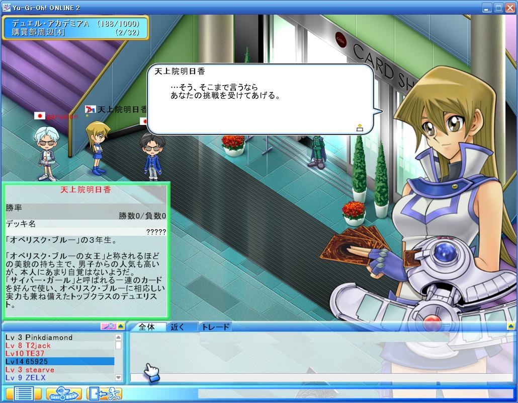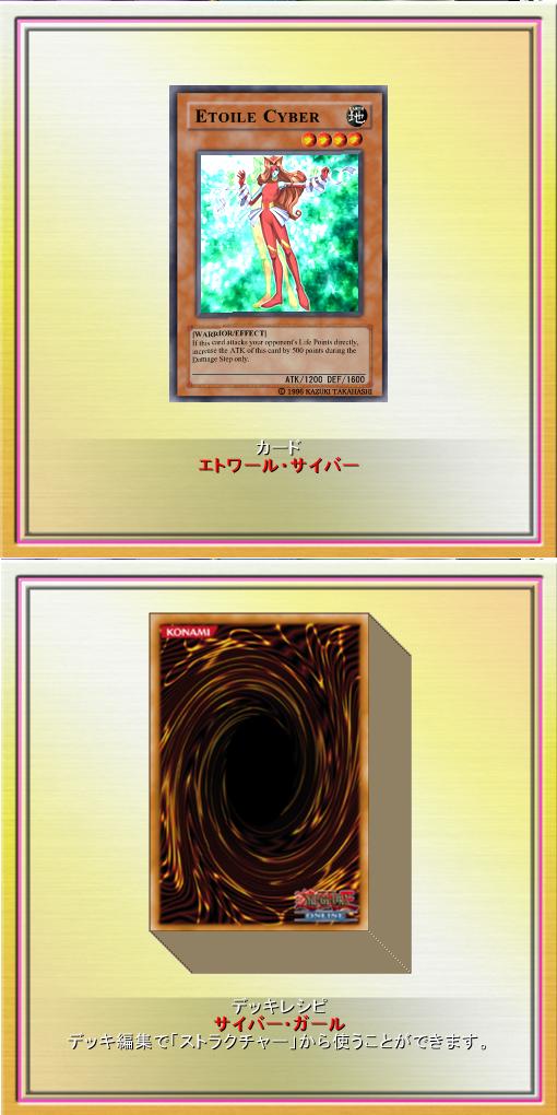 CPU対戦日記③ CPU 2007年09月18日 アカデミア側の対戦日記③天上院明日香(原作キャラ) 購買部周辺デッキ名 サイバ-・ガ-ル9勝目から サイバ-・ガ-ル2もらえるカ-ド5勝目 《エトワール・サイバー》勝敗 ○○○○○ ○○○○○原作キャラ3人目は天上院明日香。強気な発言ですな。負けず嫌いと言うか俗に言うツンデレですな。見事なまでに。現時点でのもらえたカ-ドとデッキレシピ。明日香のサイバ-・ガ-ル系は未実装のカ-ドが多いのでOCGも共に実装して欲しいものです。