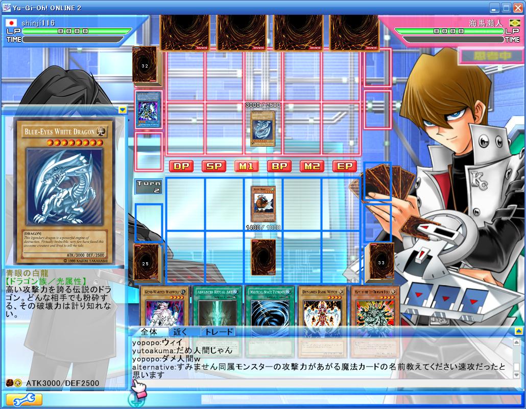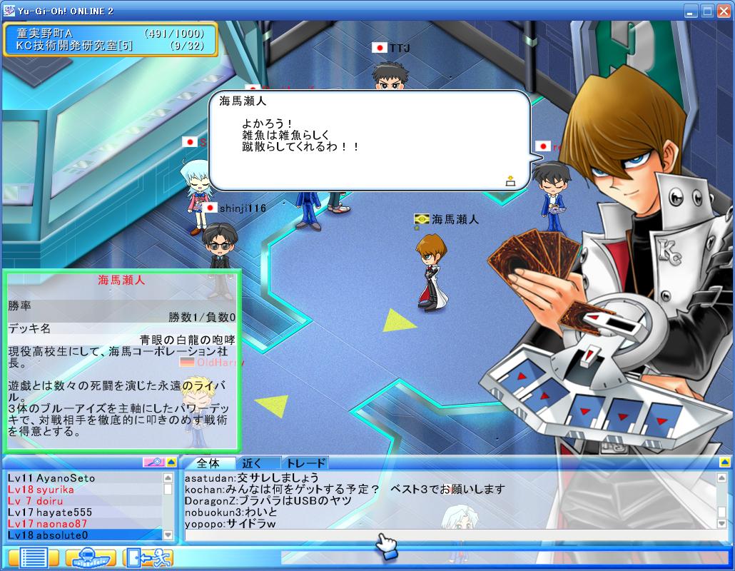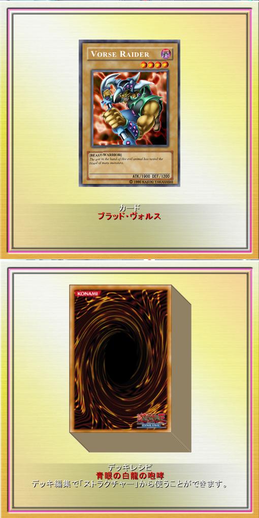 CPU対戦日記④ CPU 2007年09月24日 ドミノ町側対戦日記⑦海馬瀬人(原作キャラ)KC技術開発研究室デッキ名 青眼の白龍の咆哮9勝目から 究極の龍もらえるカ-ド5勝目 《ブラッド・ヴォルス》(柄違い)勝敗○○○○○ ○○○○○×原作キャラ4人目は社長こと海馬瀬人さすが社長、風格があります。社長の《青眼の白龍》はやはりこの柄が一番似合いますね。CPUから貰えるカ-ドの中では一番価値がありますね。さすが社長太っ腹。さて原作キャラは残すはあと二人。のんびりやって行きます。